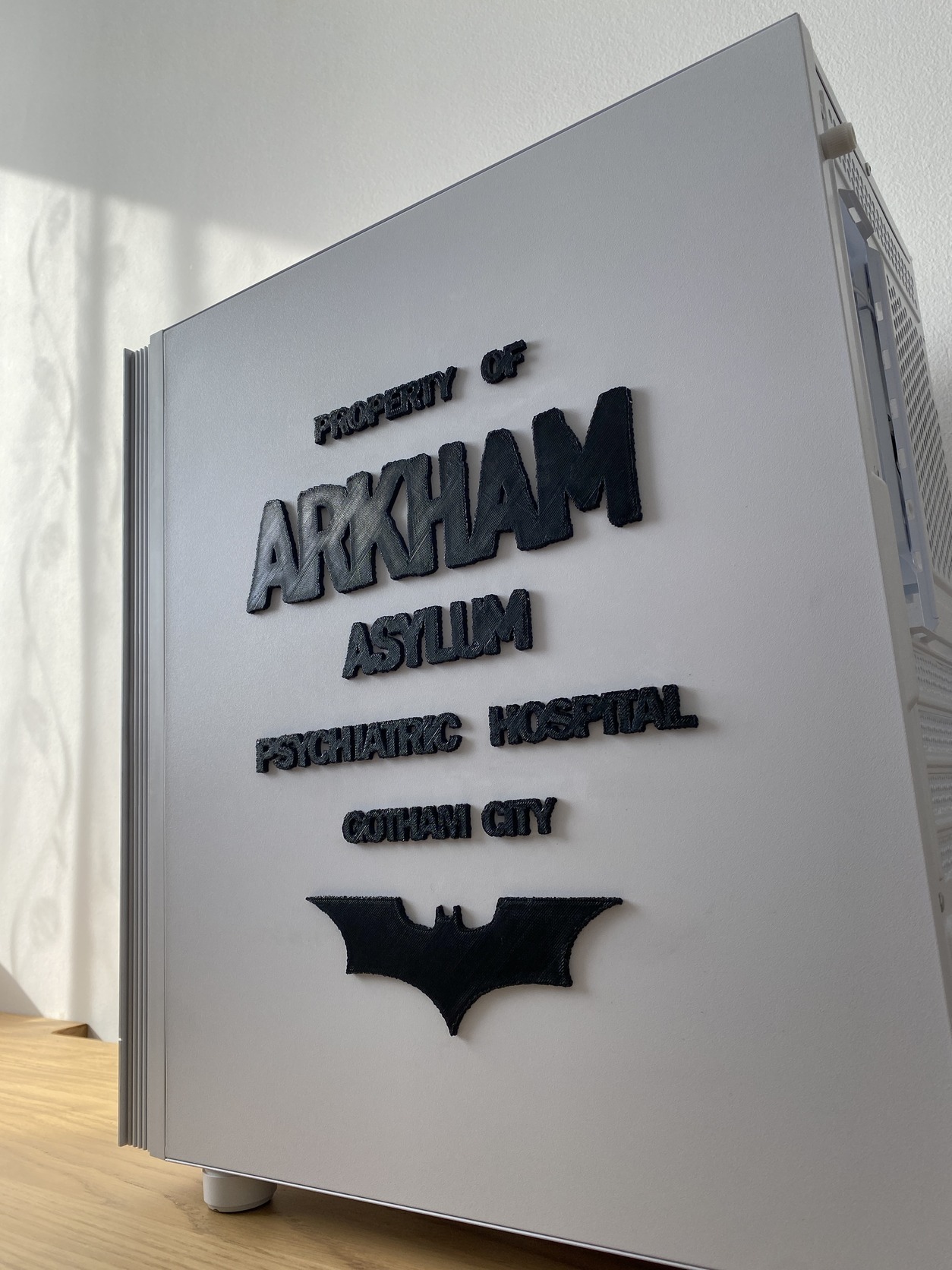 – „ARKHAM ASYLUM – Psychiatric Hospital – Gotham City” térhatású felirat az oldallapon