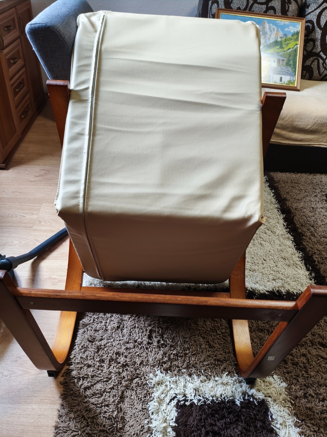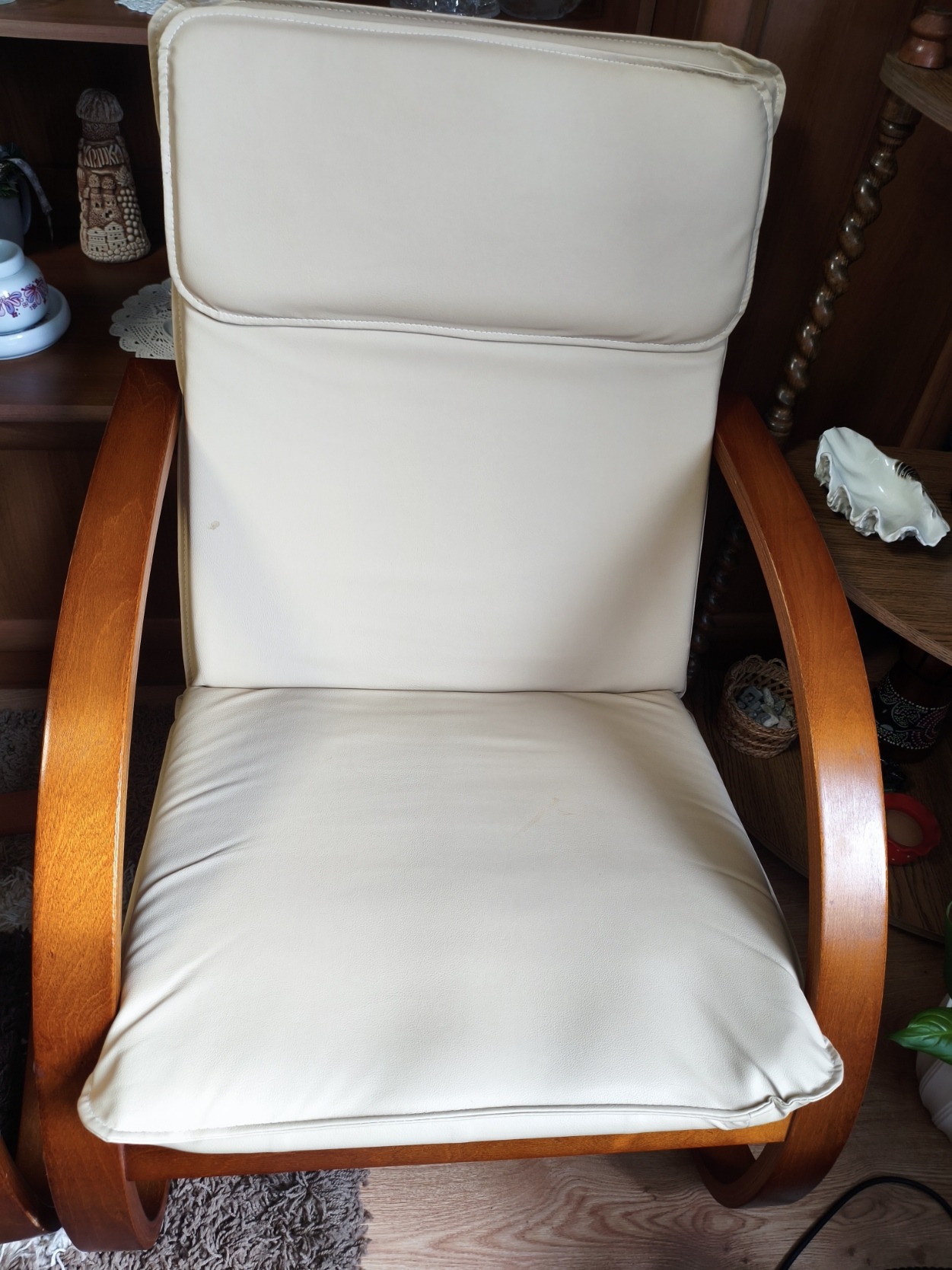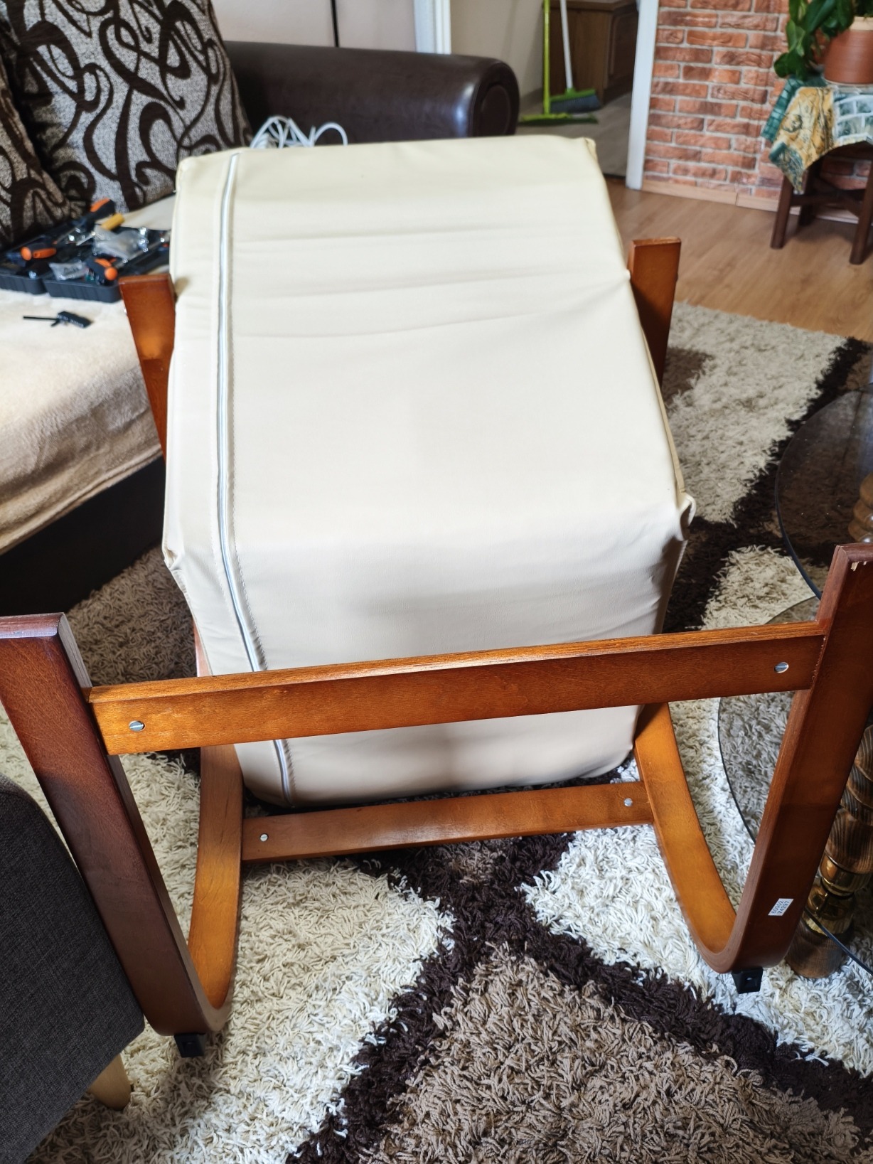 Az ülőfelület műbőr. Néhány karc van a lábakon, de elrepedve, törve nincs.
