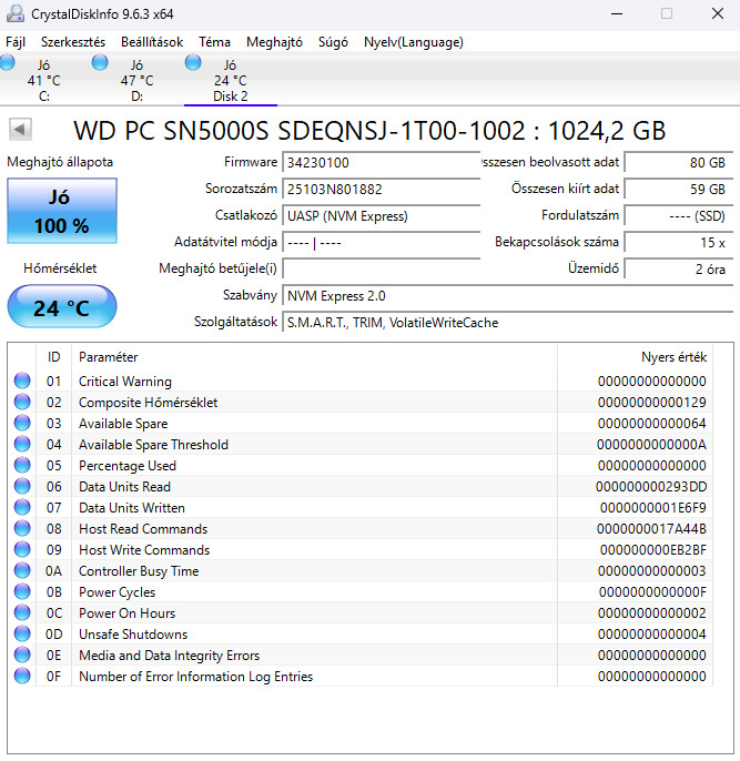 Eladó 3 db 1TB Western Digital PC SN5000S M.2 2280 NVMe Gen4 x4 SSD, pár órát futottak!