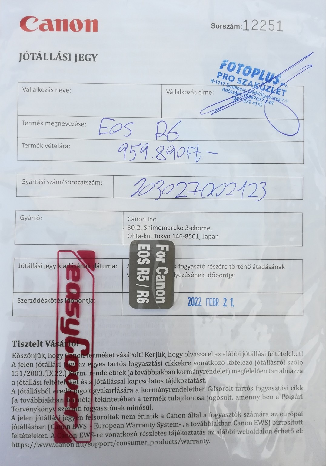Canon R6+Canon BG-R10 portrémarkolat.Eredeti Canon töltővel és 1db. akkumlátorral adom.A nyakpánt bontalan és a doboza is megvan.A gép sosem hagyott cserben, hibátlanul működik minden funkciója.Külsőleg szép állapotú, kopás- és sérülésmentes, mindig táskában hordtam és vigyáztam rá. Személyesen Martonvásáron és hétköznap Budapesten (viszonylag rugalmasan mozgok) átvehető.Postázni nem szeretném.A váz szériaszáma: 203027002123A portrémarkolat szériaszáma: 1000003344Exposzám a dokumentumokban.Ára: 385.000 ft.