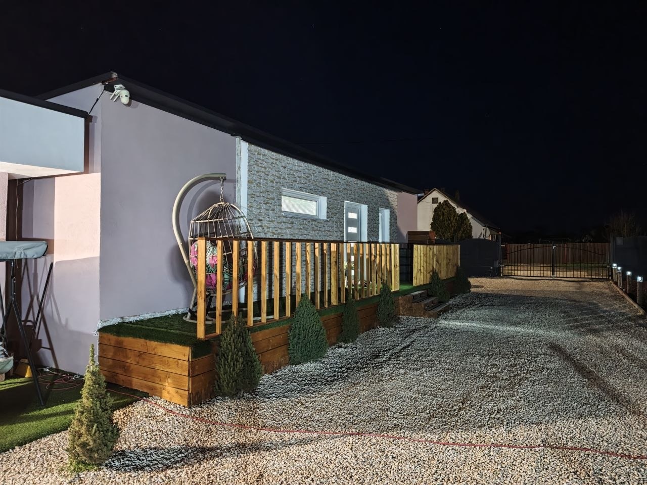 Az udvar parkosított, kétállásos lemezgarázs.