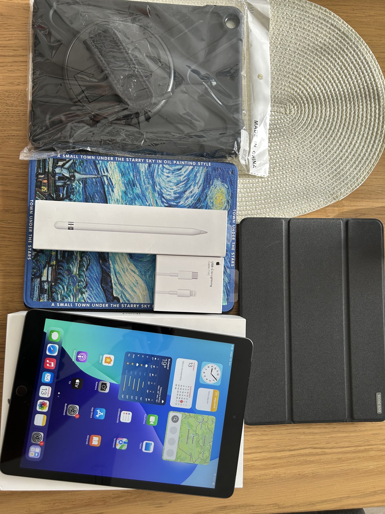 Rengeteg extra jár hozzá: adok egy új állapotú, első generációs Apple Pencilt dobozával, gyári tartozékaival (póthegyek, átalakító, stb). Jár hozzá egy bontatlan, gyári 1m-es Apple töltőkábel illetve egy 40W-os gyorstöltő. Szintén adom hozzá a három, képen látható tokot, amiből az egyik egy stapabíró darab, quadlock-szerű megoldással a hátlapján. Az extrák összértéke eléggé sok és egyben szeretnék megválni az egésztől. Az iPad egyébként az unkahúgomé volt és főleg suliba használta.