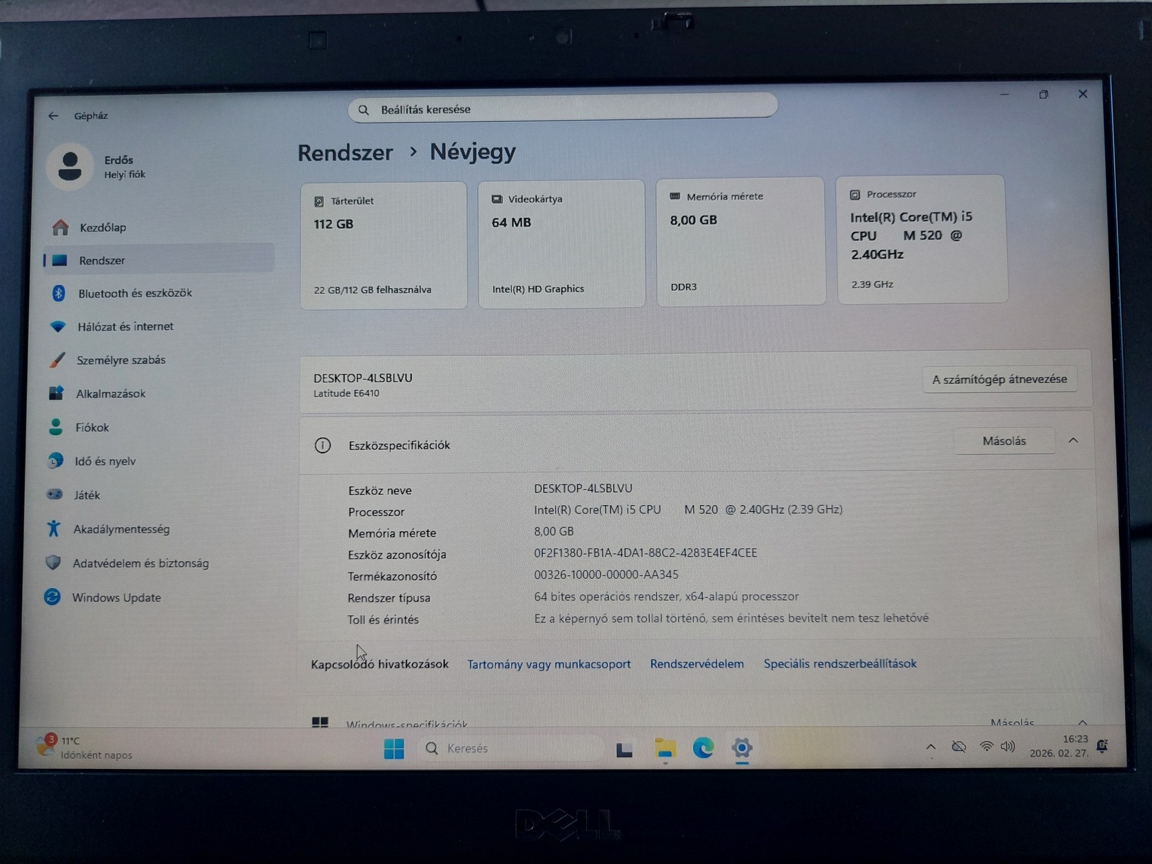 Eladó egy korának megfelelő állapotú, műszakilag kifogástalan, strapabíró Dell E6410 üzleti kategóriás laptop az alábbi paraméterekkel: