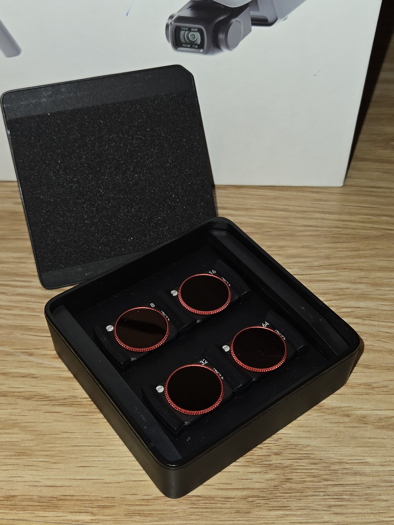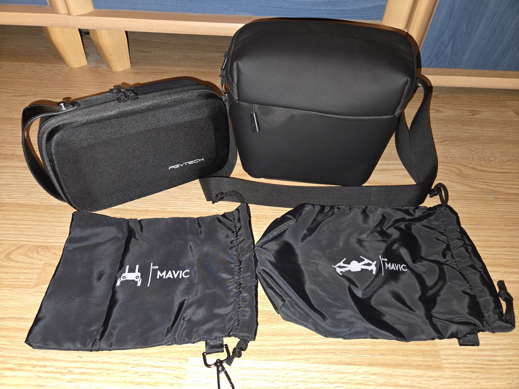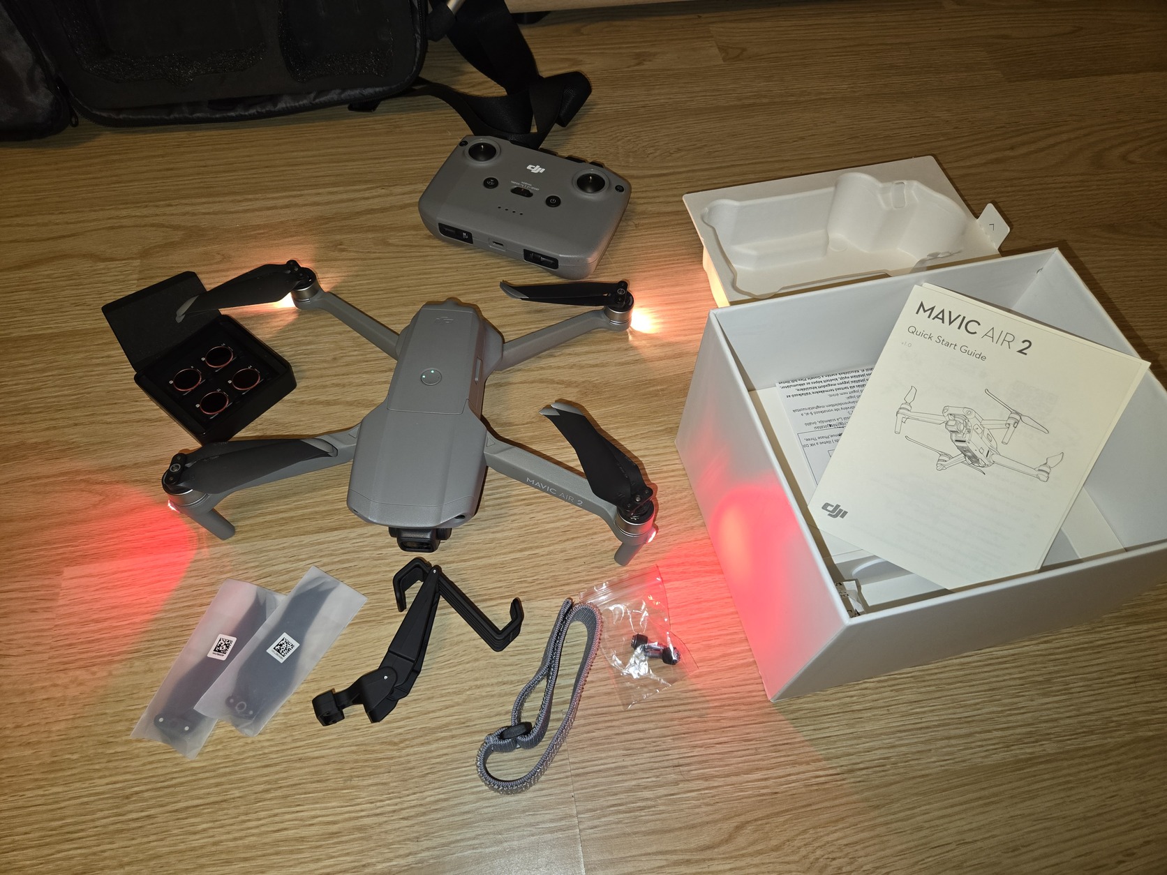 A drónhoz jár a doboza gyári tartozékai+szűrők és egyebek illetve a szürke táska.