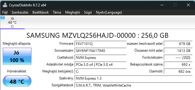 -Merevlemez: SSD: 256 GB NVMe SSD (Samsung MZVLQ256HAJD)