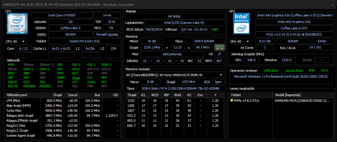 -Processzor típusa: Intel® Core™ i7-8700T 2400MHz (9MB Cache, 8 GT/s, Max Turbo 4,0GHz) CPU foglalat: FCLGA 1151