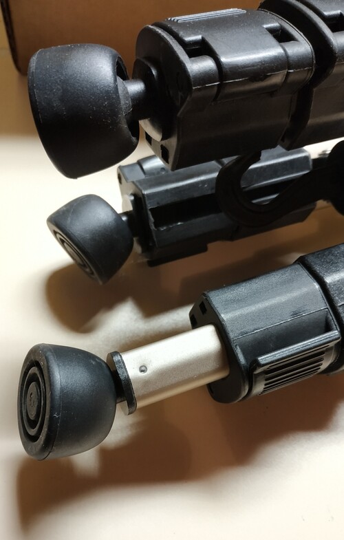 Egy hibája van: a képen látható, hogy az egyik rögzítő bilincs füle letörött, de ettől függetlenül teljesen zárható (csak nagyobb erő kell hozzá), fixen tartja a lábat. A lábak végén lévő tappancsok mozgathatók, így egyenetlen talajon is teljes felületükkel állnak.