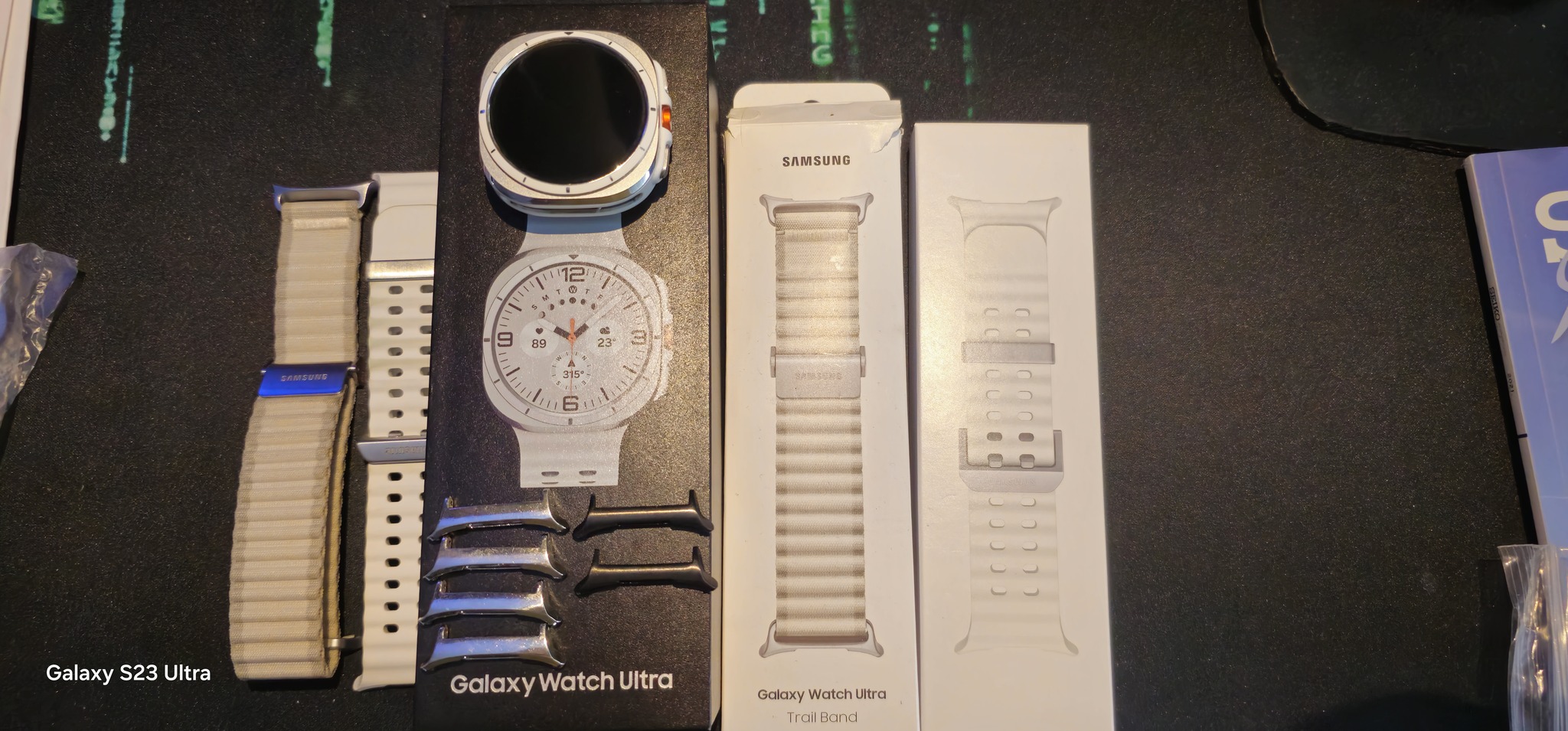 Dobozában fehér gyári szíjával + egy extra fehér szíj + extra fehér szövet samsung szíj+ két óravédő tok egy fekete és egy szürke quick releas-es + 2 pár szíjfül új szíjaknak és egy pár fekete szíjfül!