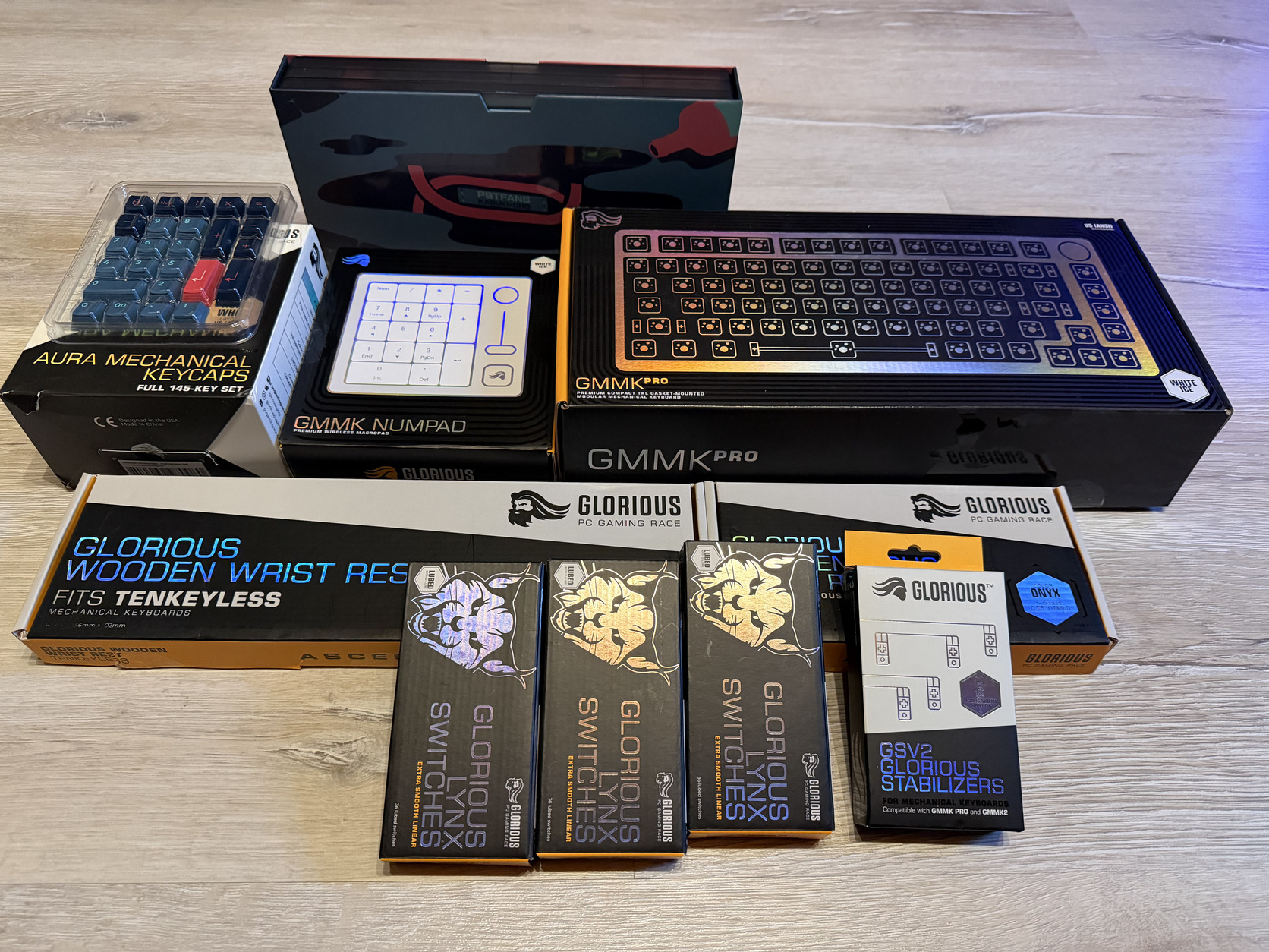 A csomag tartalmaz egy Glorious Aura White keycap szettet, de extraként vásárolható hozzá a képeken is látható PBTFANS KABUKI-CHO (alap és numpad is) szett is.