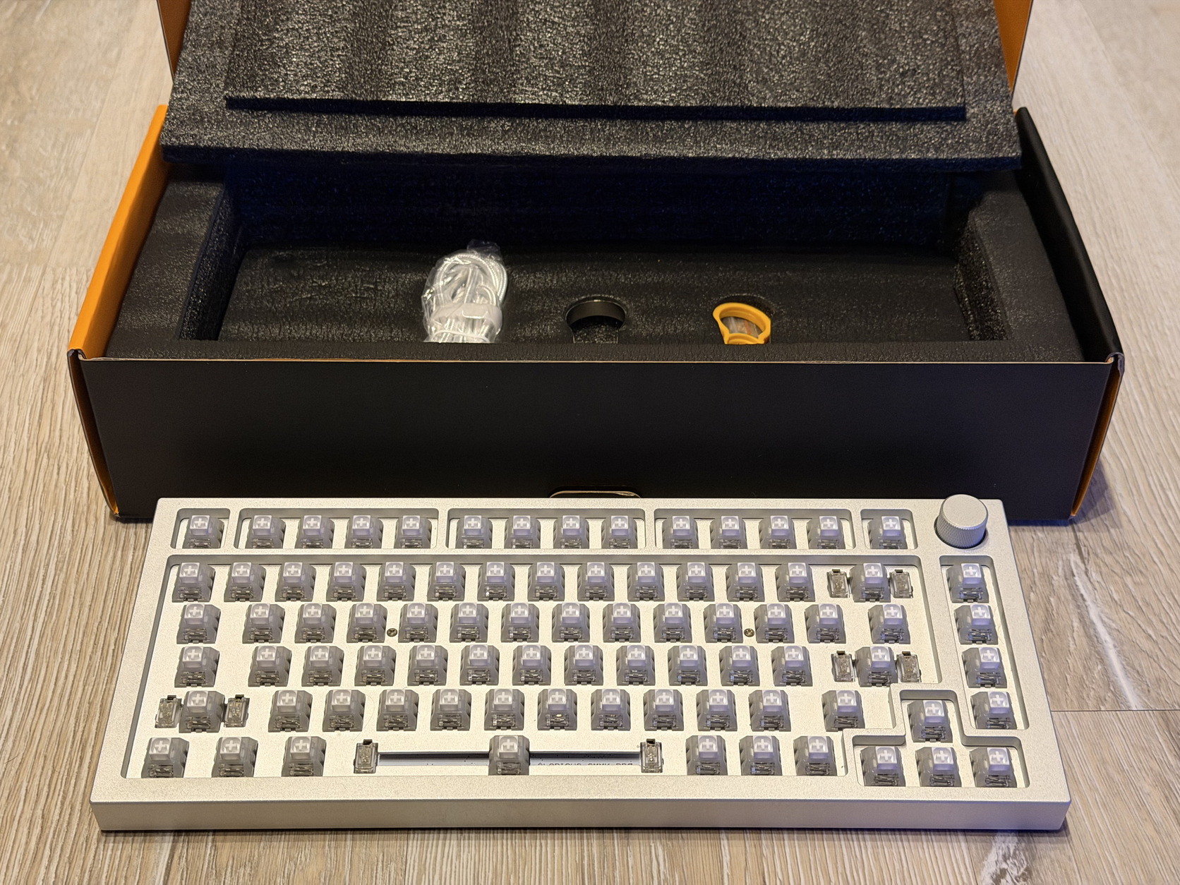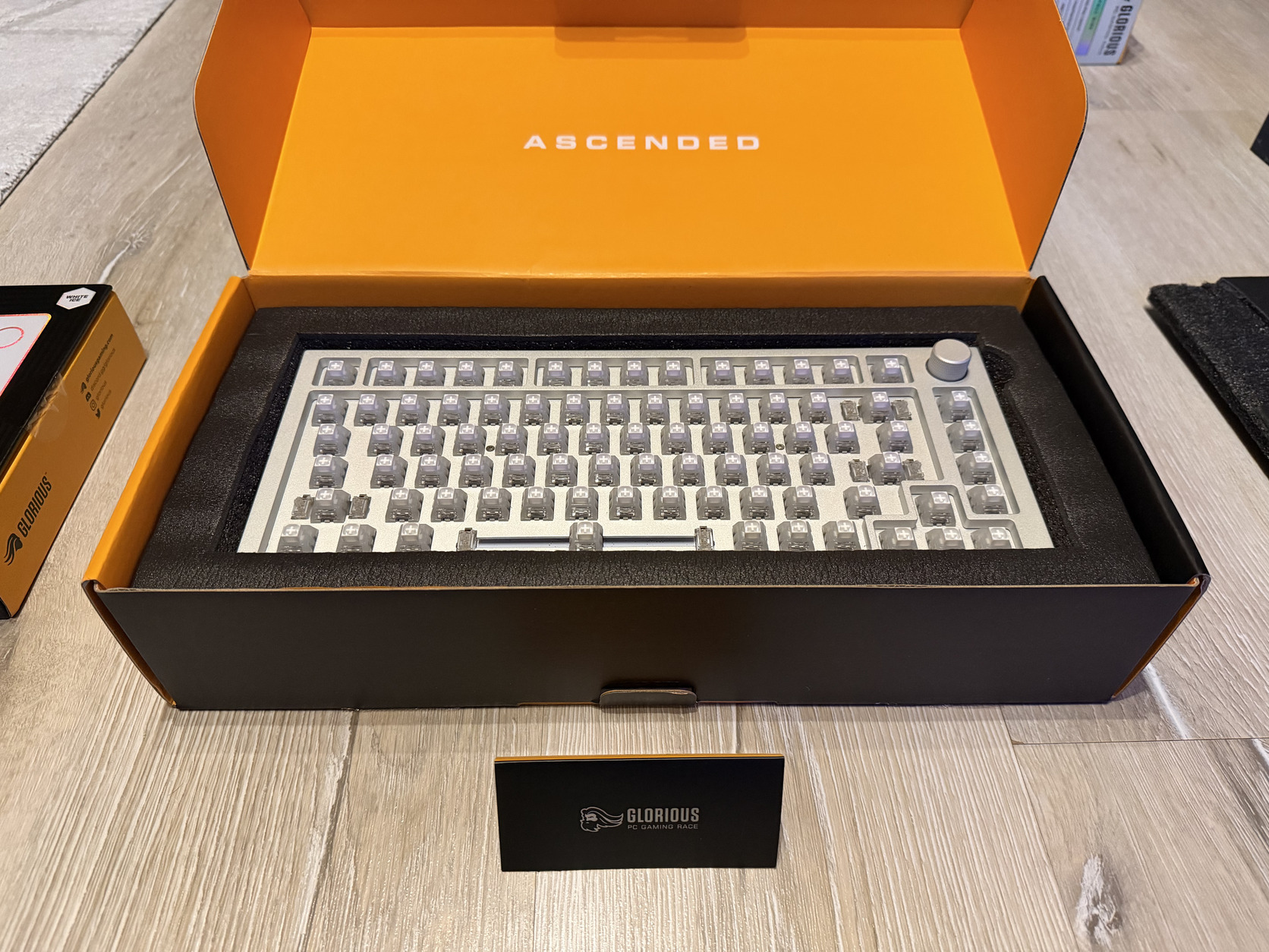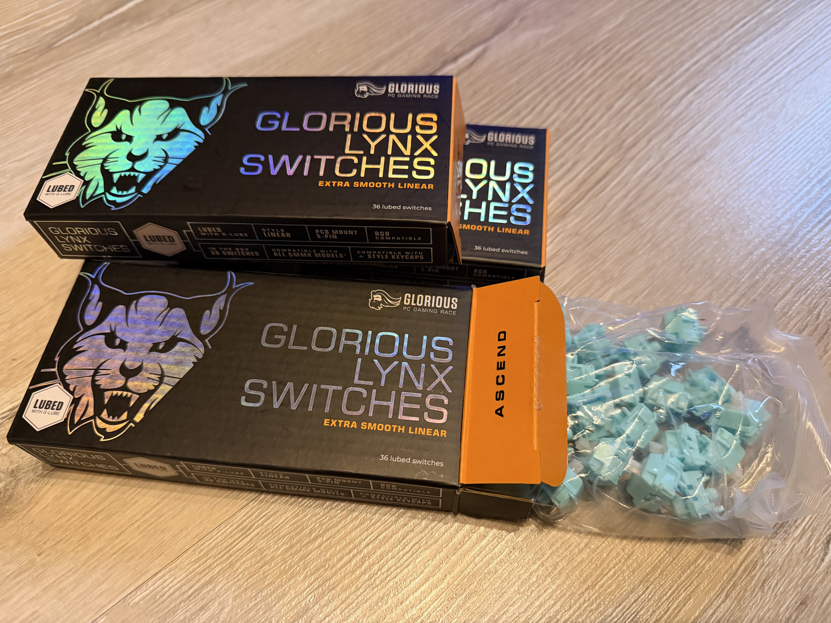A képeken a billentyűzet Kailh White Owl switchekkel van szerelve (clicky), viszont a csomagban vannak hozzá Glorious Lynx MX lineáris kapcsolók is (lubed).
