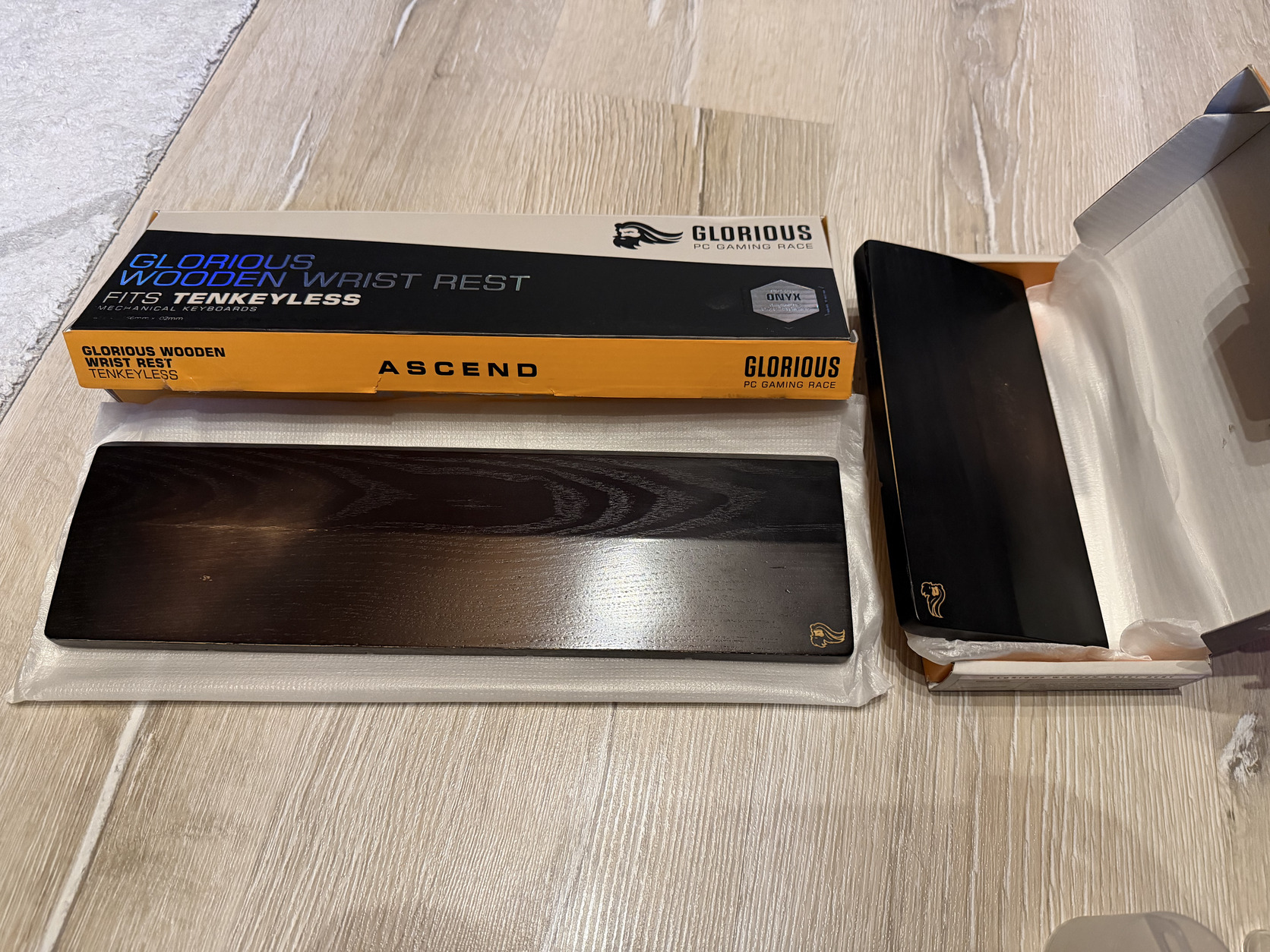 A csomagban található még két Glorious fa csuklótámasz is, egy a billentyűzethez egy pedig egérhez, felületükön kisebb kopással.
