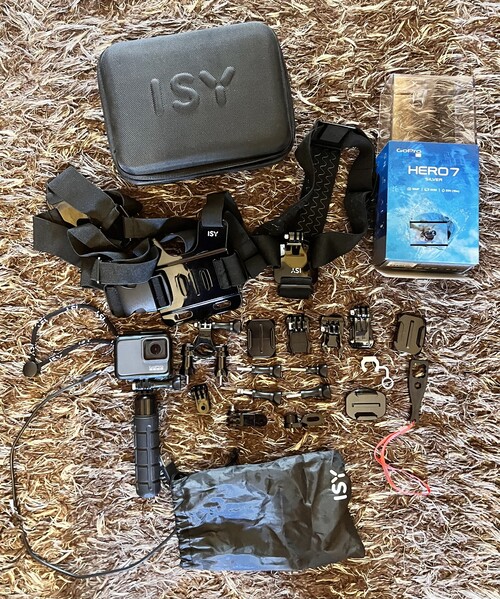 Eladó a képen látható kiváló állapotban lévő GoPro Hero 7 Silver akciókamera 128gb-os Samsung microSD kártyával és különféle kiegészítőkkel (fejpánt, testheveder, hordozótáska, stb.). Eredeti doboza és kábele is jár hozzá.