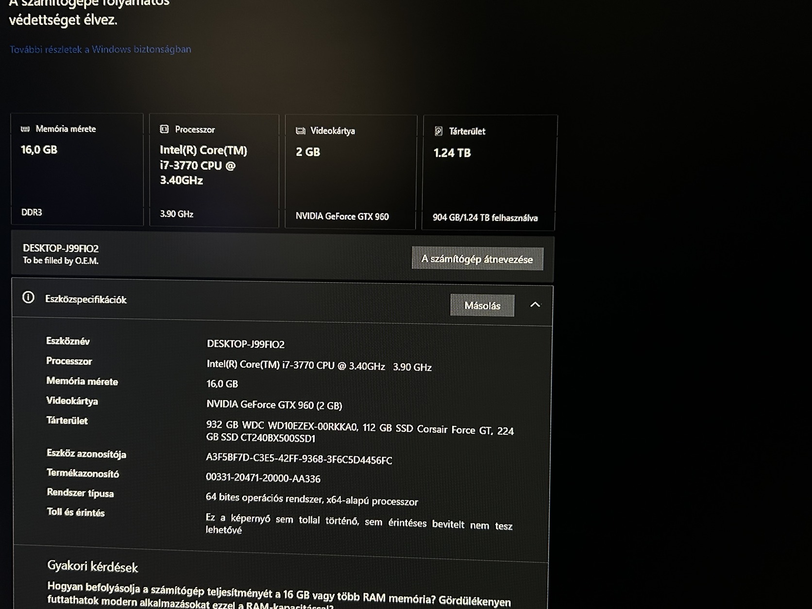 Tárhely: 1.24 TB összesen ebből, 932 GB Western Digital HDD, 112 gb SSD Corsair Force GT, illetve frissen vásárolt 224 GB Crucial BX500 2 év garanciával!