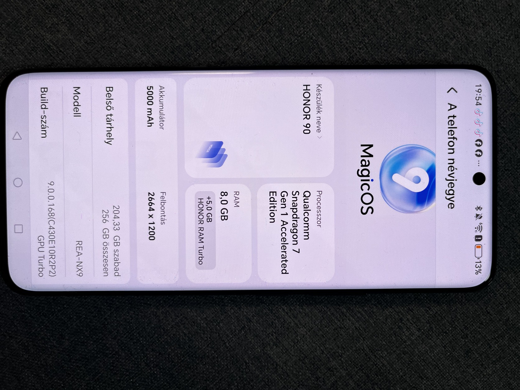 Eladó a képen látható Honor 90 256gb. 2,5 évvel ezelőtt vásároltuk, eladás oka,hogy újabbra váltunk. A telefonon található pár apró hajszálkarc(látszik a képen is) de ezek a használatát nem befolyásolják. Az ár minimálisan alku képes. Máshol is hirdetem.