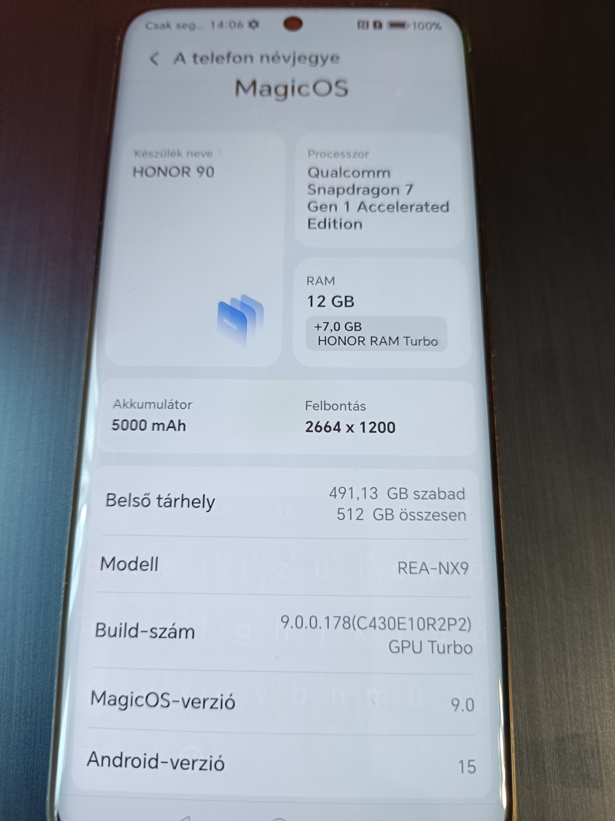 Eladó a képen látható Honor 90 telefon. 12+7Gb memória és 512Gb Tárhely. Megkimélt állapotú.