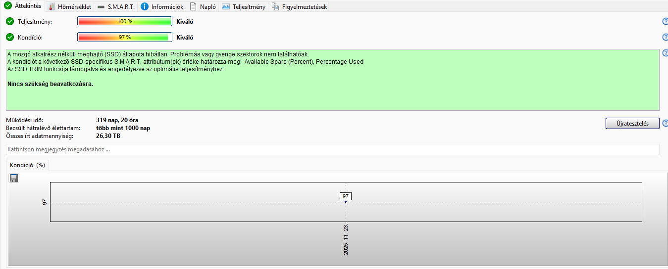 2020 végén vásárolt, 2024 áprilisa óta csak másodlagos SSD-ként vagy egyáltalán nem használt. HDS szerint 97%-os kondícióval.