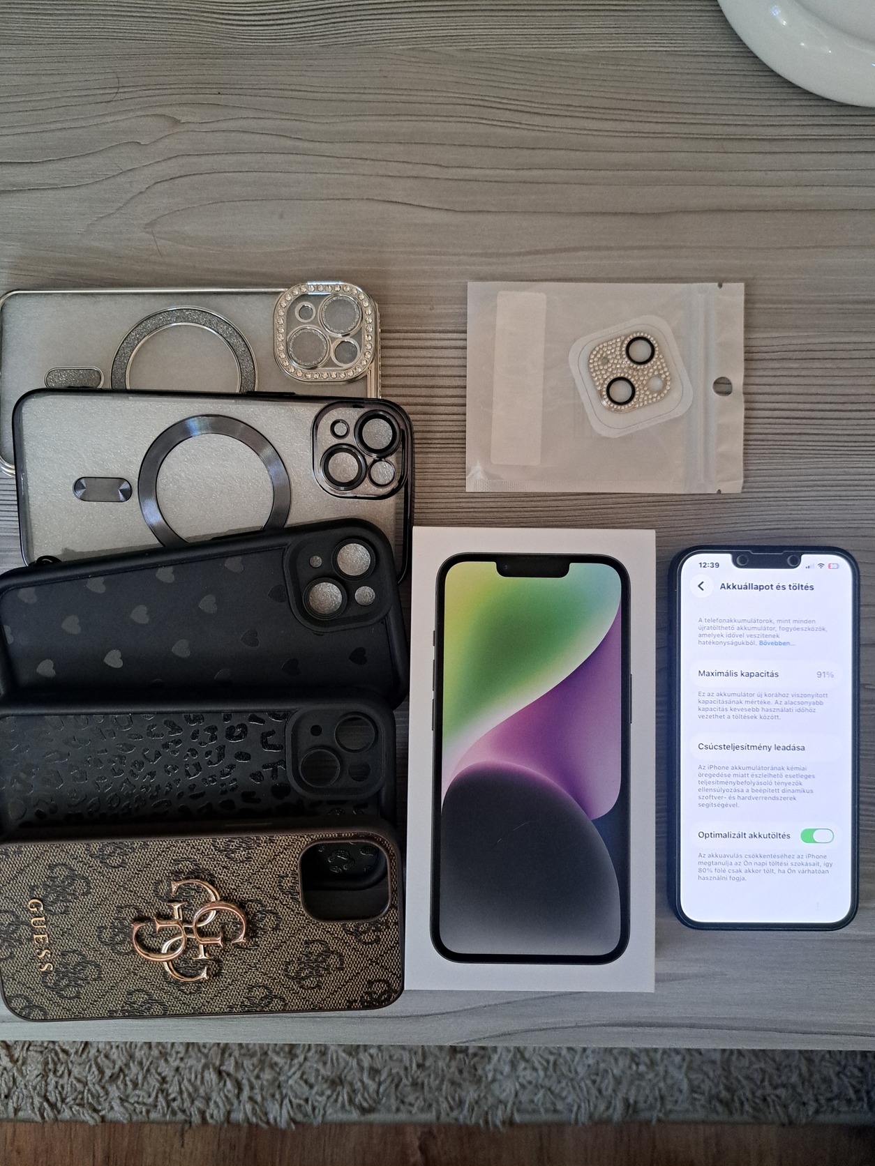 Eladó a képeken látható Iphone14 Midnight 128Gb, hibátlan,91%-os akksi, kártyafüggetlen, üvegfóliával védett, hátulján kameravédő(levehető), 5db minőségi tokkal,plusz kameravédővel, dobozában, kábelével.....karcmentes, gyári állapotú.