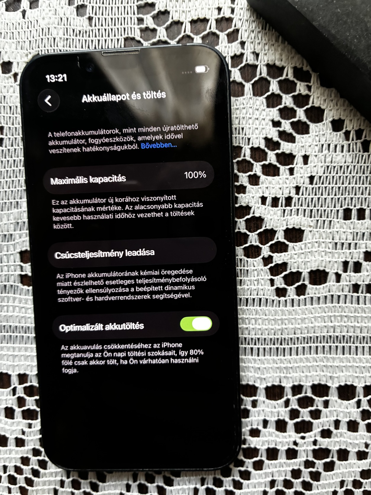 Az akkumulátor állapota a beállítások szerint 100%.