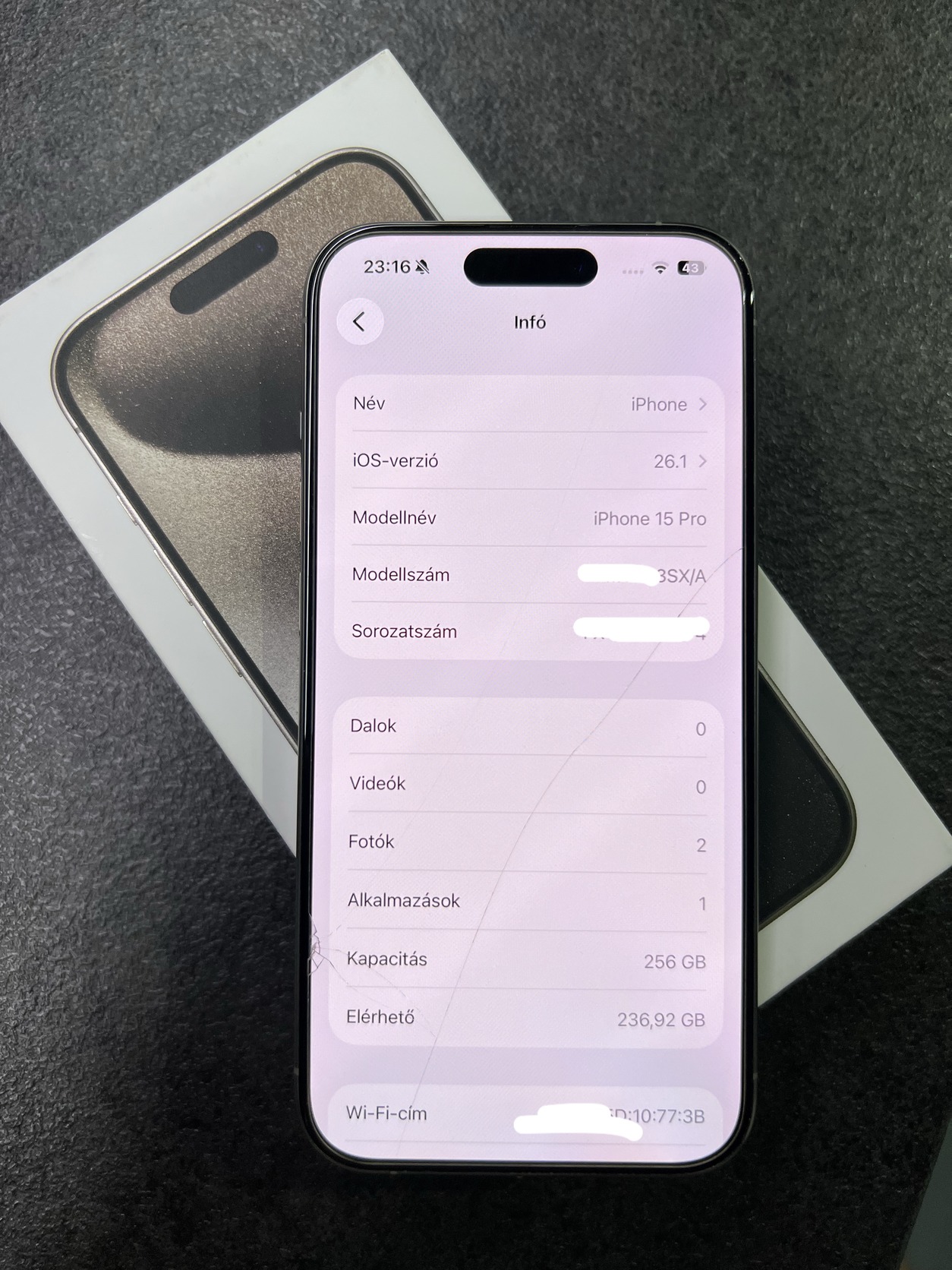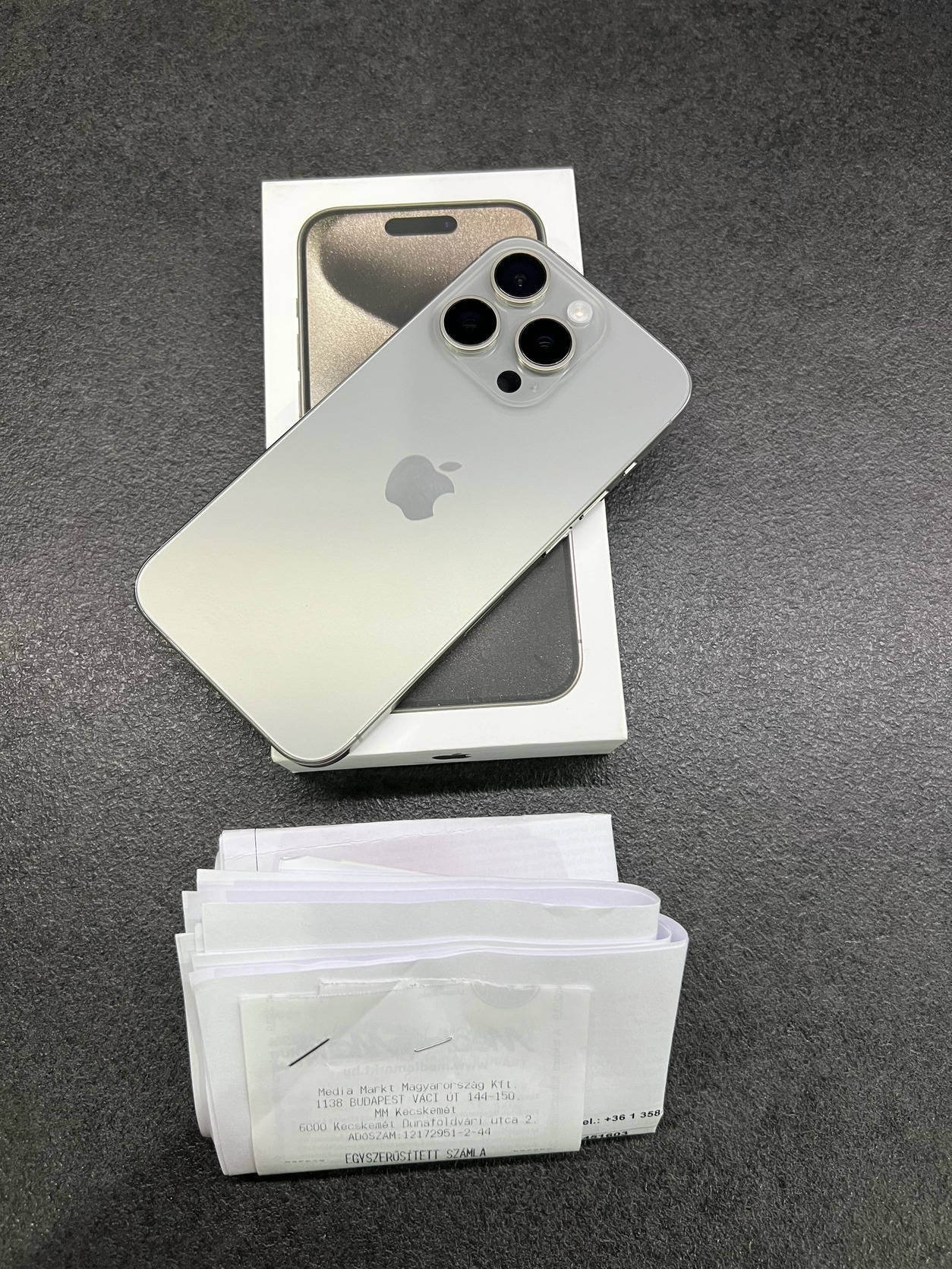 Eladó a képen látható Iphone 15 Pro 256GB gyári független, media markt vásárlás, ami 2026. novemberig garanciás. 87% akkumulátor, bőven egy napos üzemidő. Üvegfólia sérült, kijelző is hibátlan!