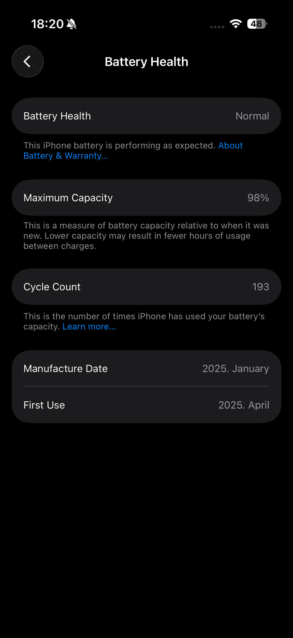 - Töltési ciklusok száma: 193