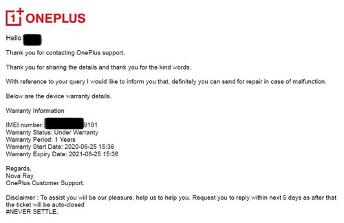 A készülék a Turbado-n lett vásárolva (számla megvan), de nem érinti a pár hónapja bekövetkezett csőd (!) Beszéltem a Oneplus-al és írásosan megerősítették IMEI alapján, hogy 2021.06.25-ig ők felelnek a készülék javításáért meghibásodás esetén (csatoltam egy képet, ami ezt igazolja).