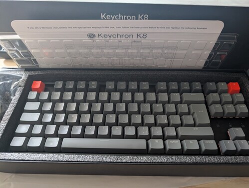 Eladó Keychron K8 mechanikus billentyűzet + Keychron Silet K Pro switch + angol keycap szett. Bluetooth és vezetékes billentyűzet, használható mac és windows rendszereken.