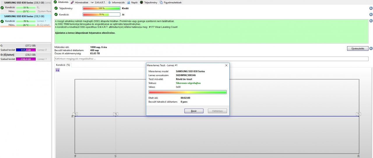 100/70% 1000 napot futott (jelenleg is aktív és tökéletesen szuperál) ezért S.M.A.R.T 30% ot levett ez csak azért van mert egy bizonyos futási idő után esik a kondíció százaléka ennyi, semmi több.