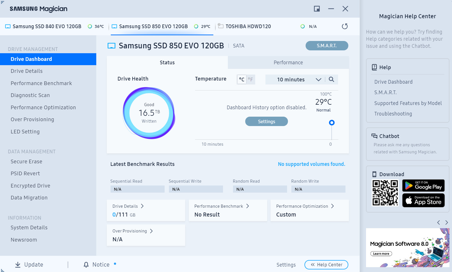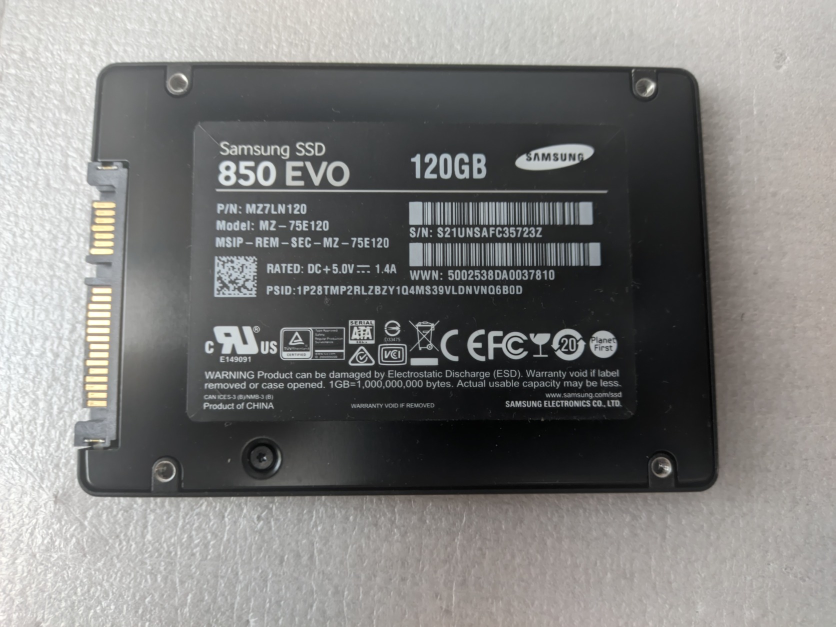 Eladó a címben szereplő, Samsung márkájú 120 GB-os 850 EVO 2,5"-os SATA-s SSD. Hibátlan, saját tesztprogramja hiba nélkül lefut. Teljes ráírt adatmennyiség 16,5TB.