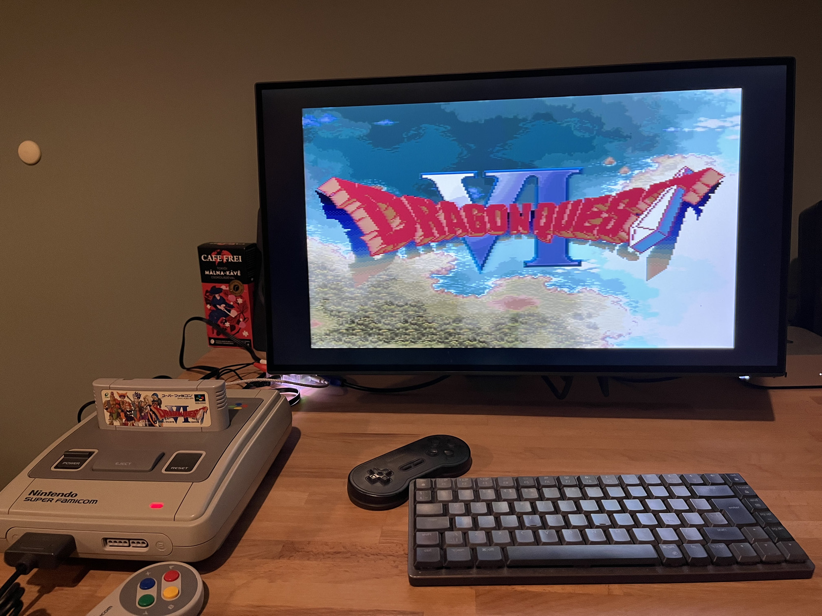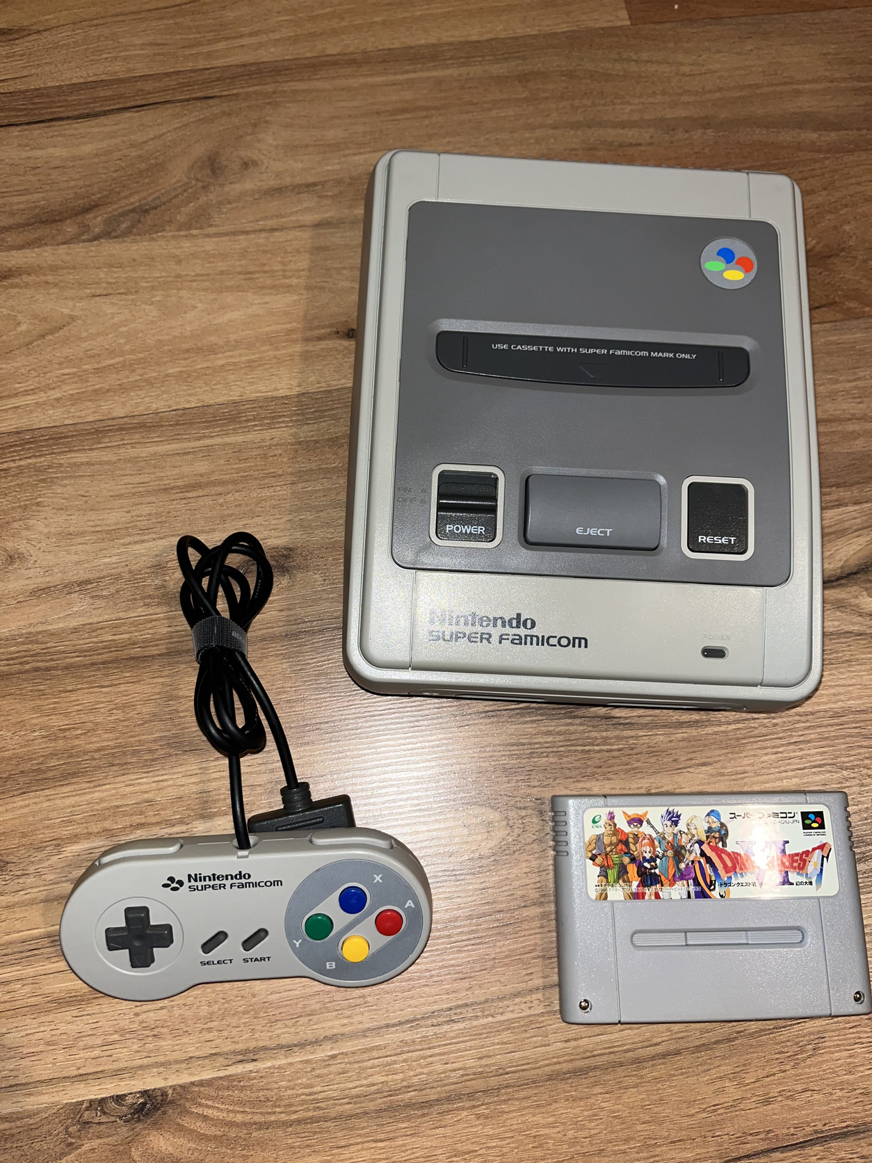 Egy darab gyári kontrollerrel és Dragon Quest VI játékkal.