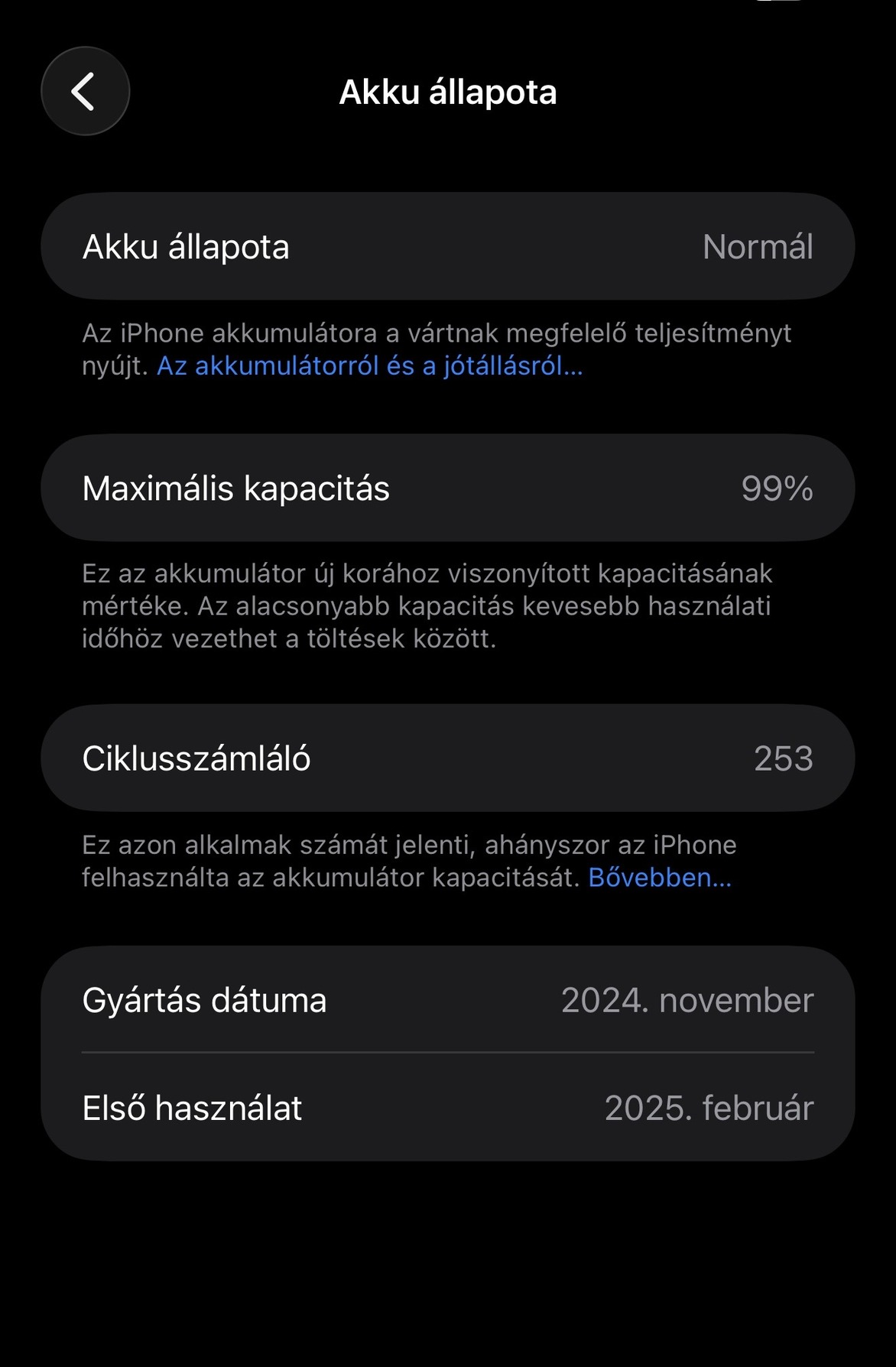 Eladó Iphone 16 pro max készülékem! Szuper állapotú! Végig tokban hordtam. 2028.ig van rá garancia! 99%-os akku kapacitás 253 ciklusszám. 256gb-os