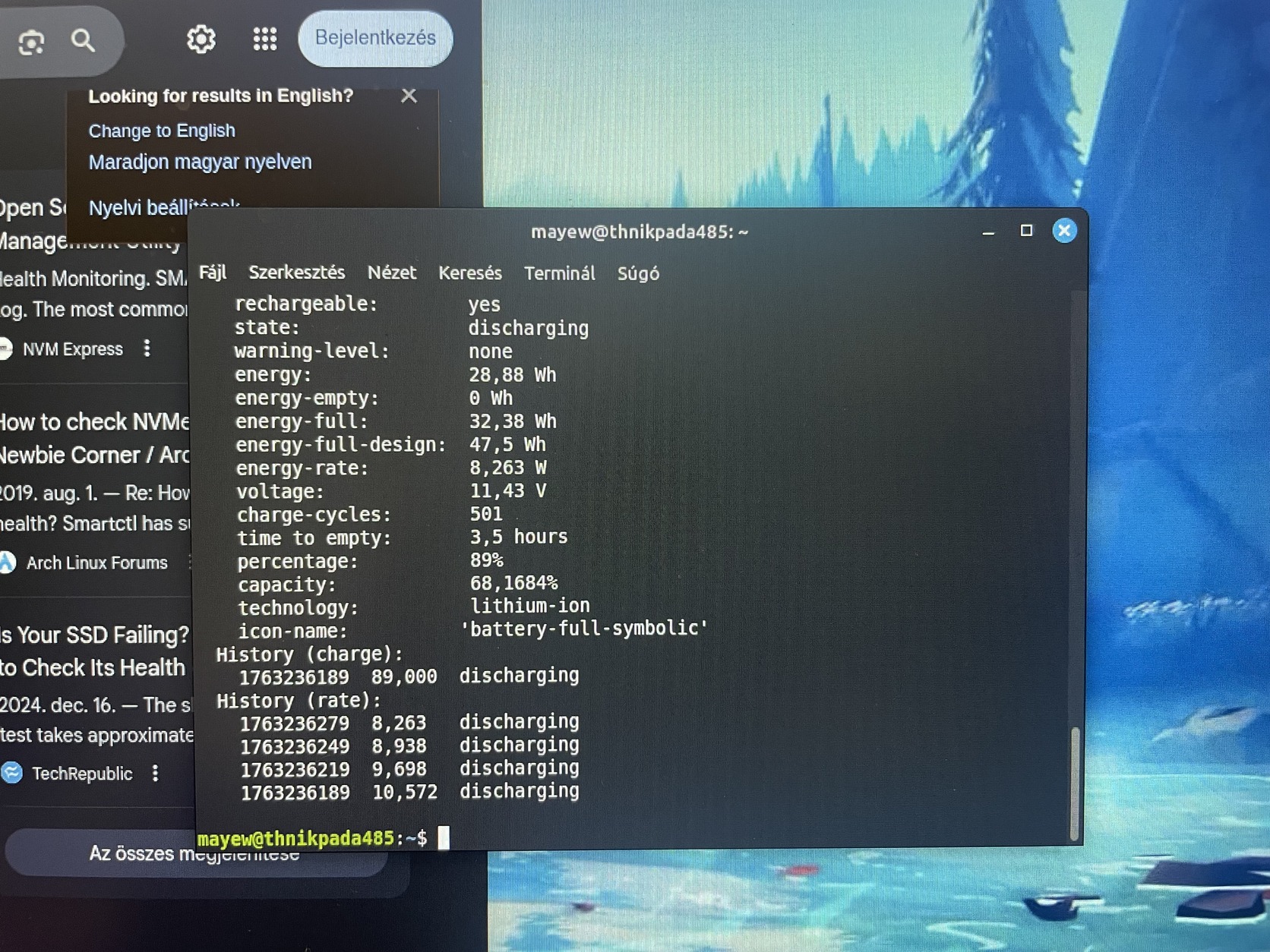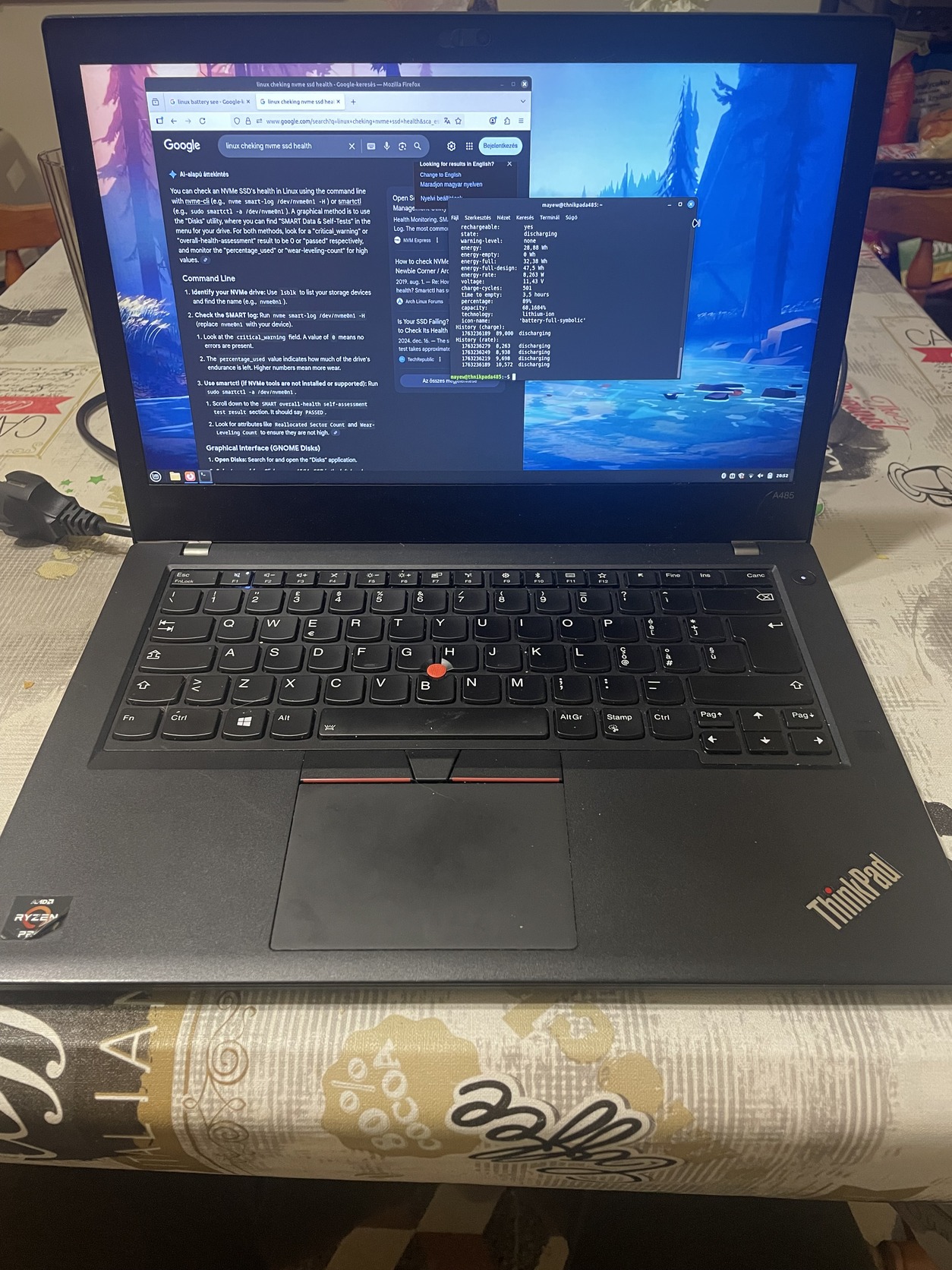 AKKU: 2 darab a belső az teljesen halott. A külső nagy akksi 47.5WH eredetileg ebből 68% körül tud. Nagyjából 3 óra üzemidő.