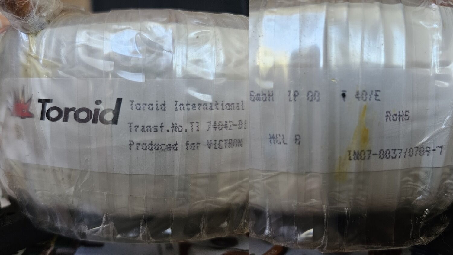 Emlékeim szerint UPS-ből lett kiszedve. Tömege /3,7 kg/ alapján 400 VA környéke lehet. Az alapja egy 13 cm szabályos háromszög. Külső átmérője 13 cm, belső 5,5 cm, magassága 5 cm.
