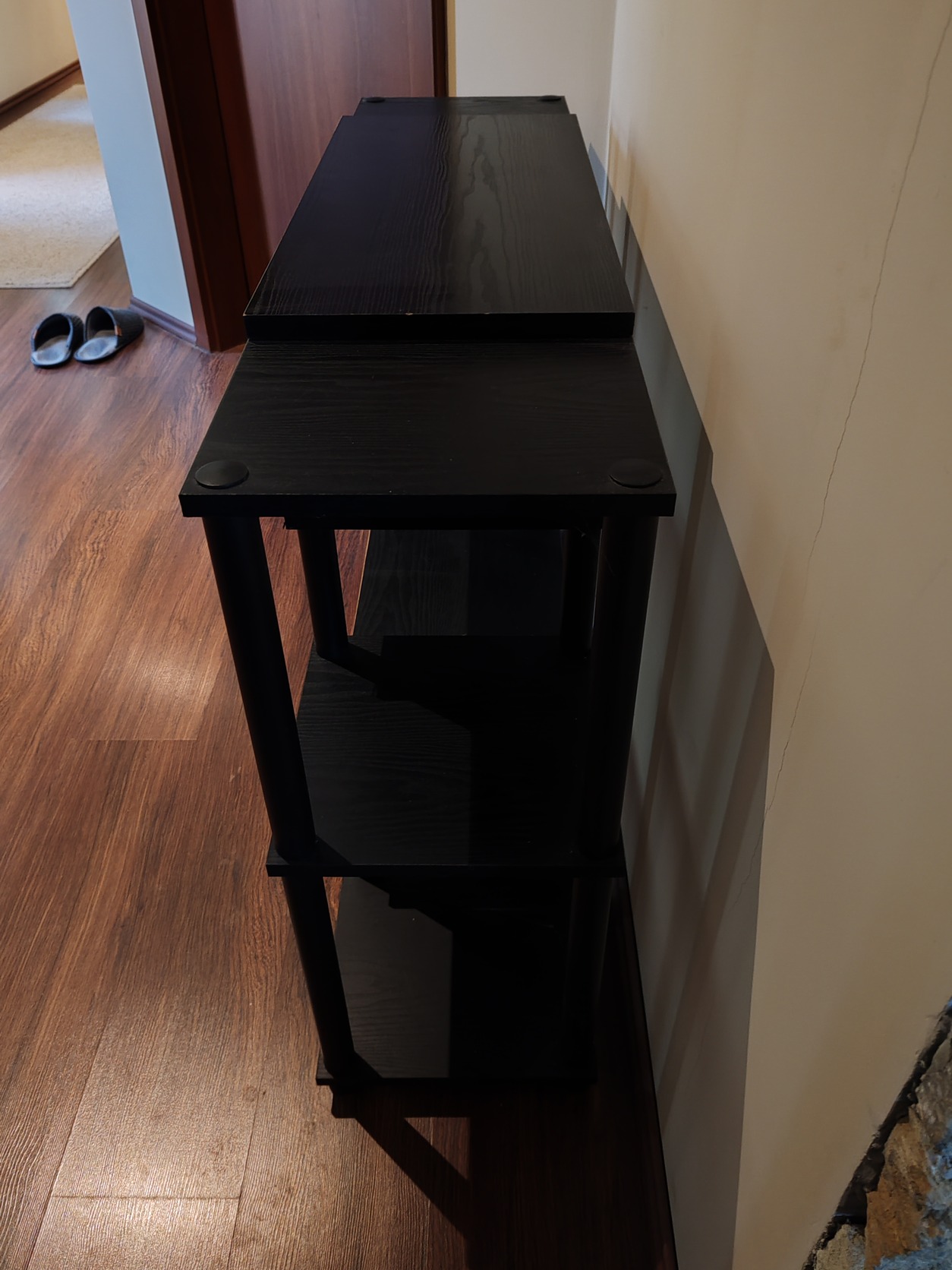 Eladó TV/Hifi állvány, többszintes, fekete színű fa szerkezett, műanyag lábakkal, masszív kialakítás, szerkezetileg hibátlan, szétszerelhető!