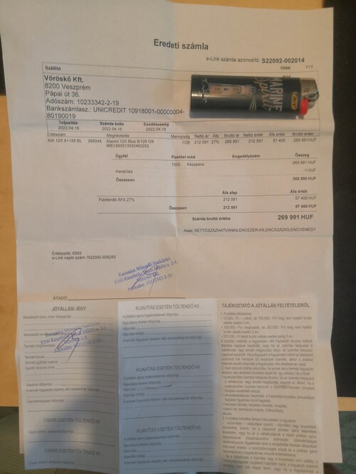 Számla,jótállási jegy a képek között.