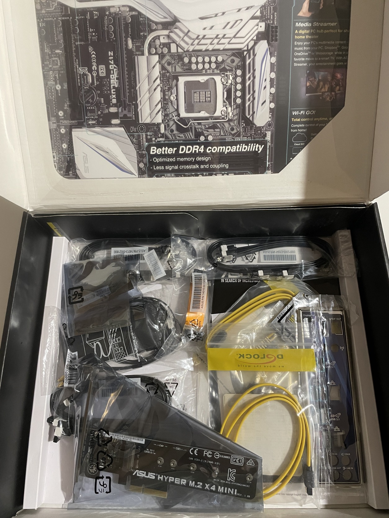 Alaplap: ASUS Z170 Deluxe, nagyon szép és megkímélt állapotú a lap, a doboz, és minden tartozék (2db SATA kábelt pótoltam benne, de csak sárga színű van épp otthon).