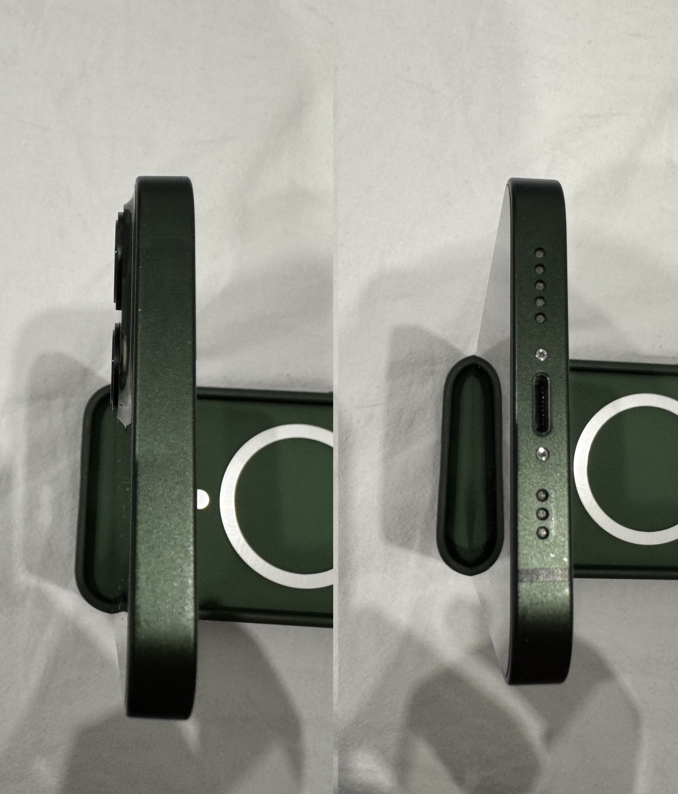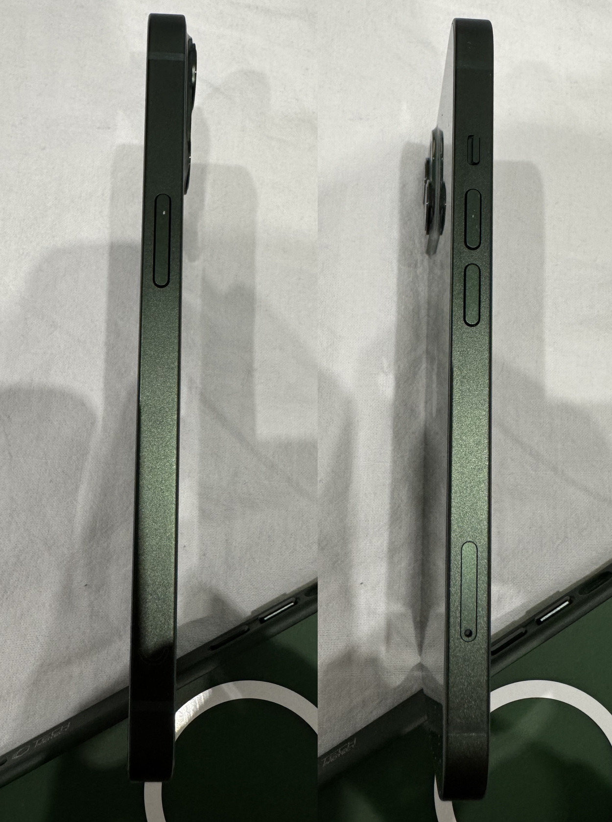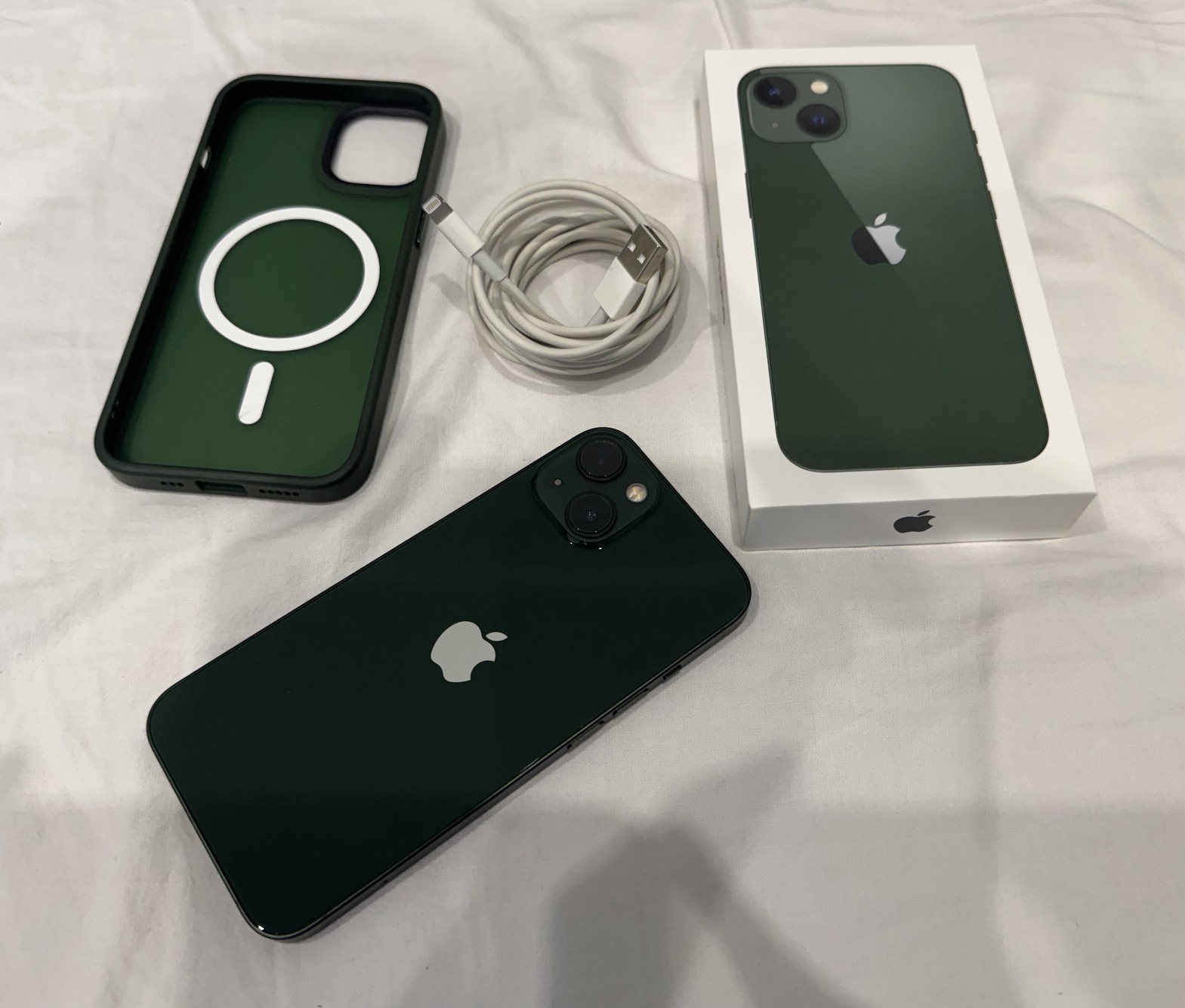 Eladó a képeken látható zöld Apple iPhone 13, 128 GB-os tárhellyel, 2 méteres USB-A - Lightning kábellel és Tech-Protect tokkal.