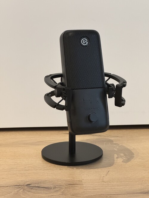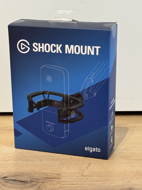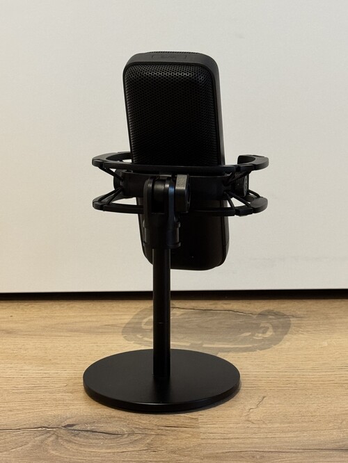 A gyári tartó keret elhasználódott, így egy gyári Shock Mount-tal került rögzítésre a talpához ami jár is mellé, természetesen a gyári USB-C kábelét el együtt. A mikrofon doboza már nincs meg.