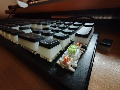 Egy NATEC Genesis Thor 300-at restauáltam és építettem át. Az eredeti keycapeket, stabilizátorokat és switcheket lecseréltem. A régi keycapek helyett fekete pbt puding keycapeket raktam fel, a stabilzátorokat lubeolt Everglide Panda V3-akra cseréltem. A switchek helyére az egyik legjobb clicky switchet, lubeolt Kailh Box Jade-eket építettem be. Poly-fill és tape modolva. A keycap set további darabjait hozzá adom.