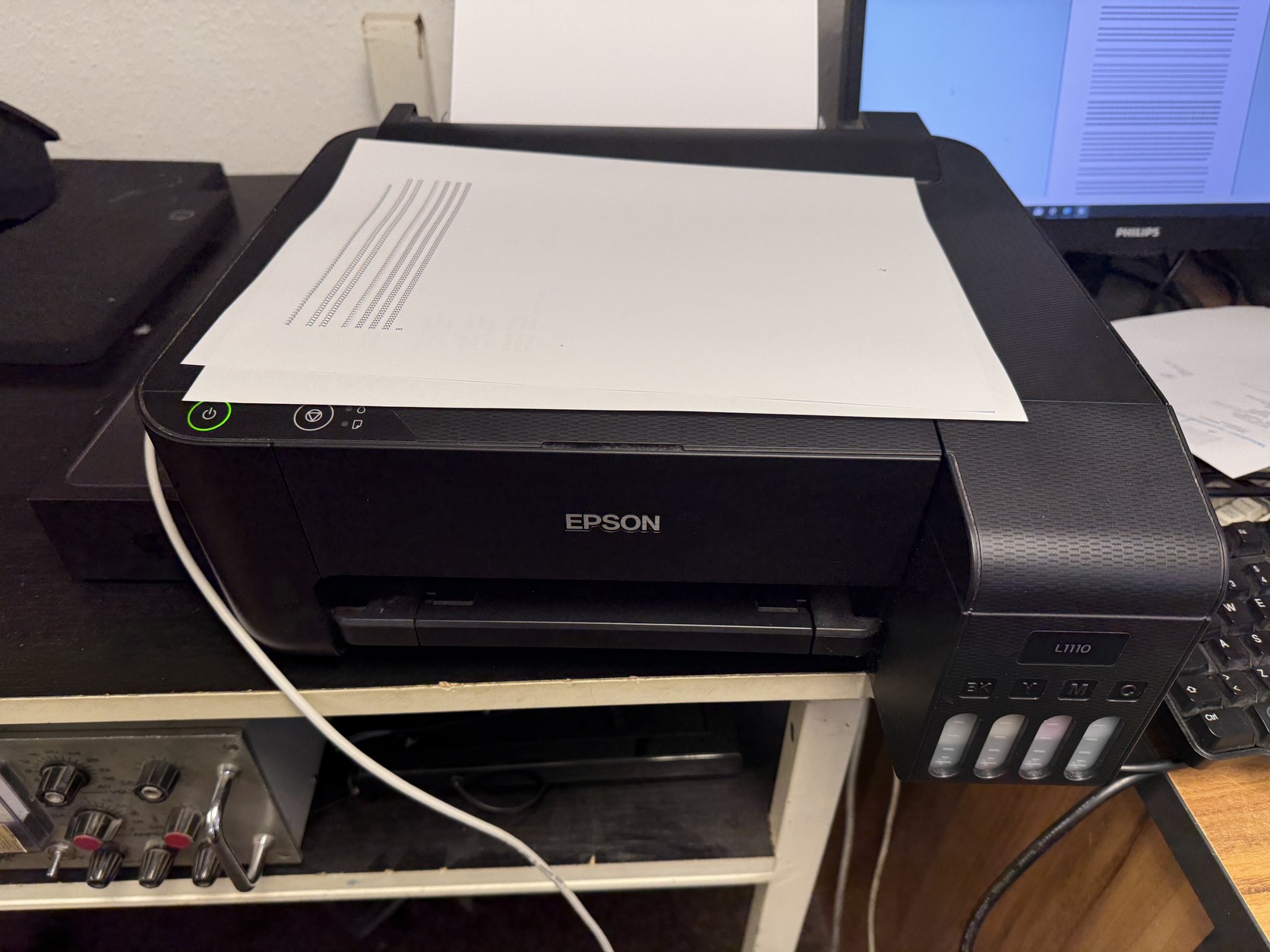 Eladó a fent említett külső tintás epson nyomtató. Nem MFP csak sima színes nyomtató. A fent látható módon nyomtat, nem túl szépen nyomtat elég csíkos/halvány/töredezett. A fent látható képeket FEJTISZTÍTÁS UTÁN nyomtattam.