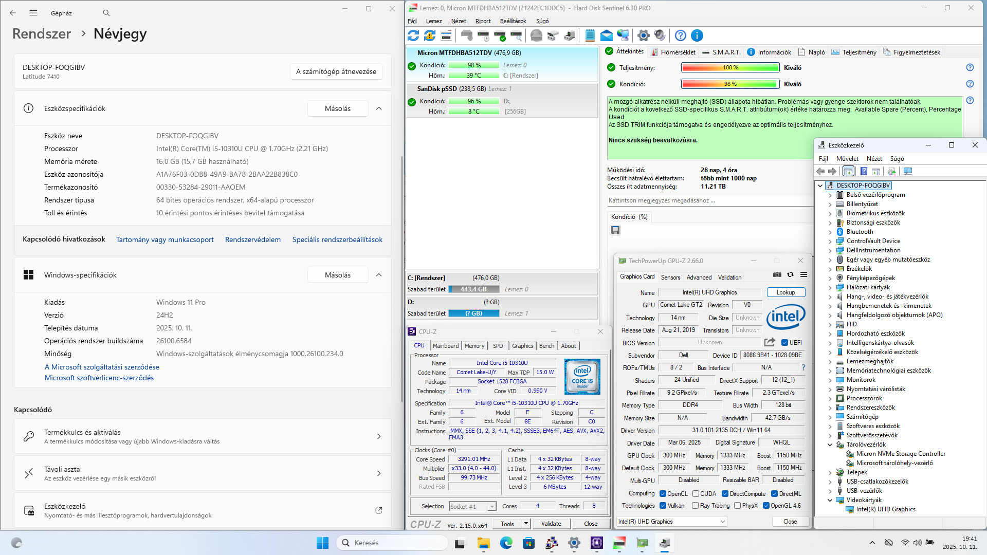 CPU: Intel Core i5-10310U / 4 mag, 8 szálon / 1.70/4.40GHz, 6MB smart cache