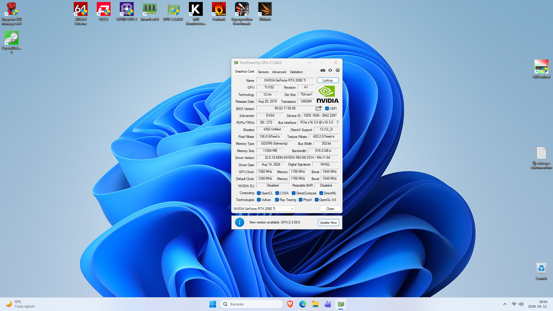 Videókártya: EVGA GeForce RTX 2080 Ti Gaming 11GB GDDR6 352bit