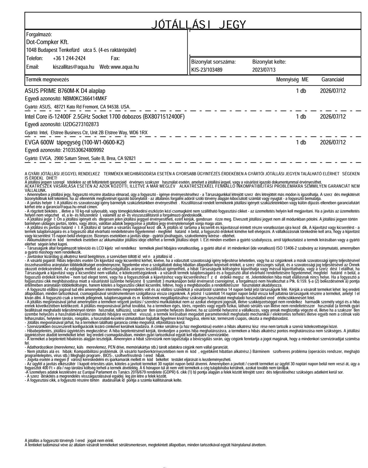 2026.07 hó ig aqua garancia személyes átvétel és