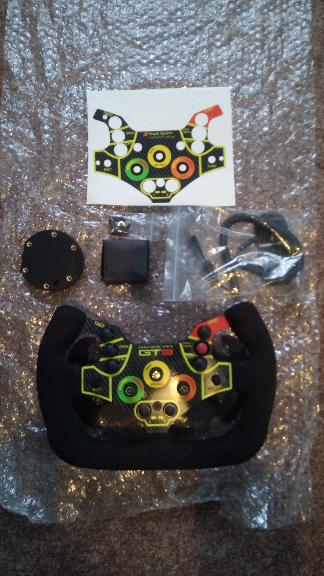 Eladó 2025.06.14-én vásárolt garanciális Evo SIM Huracan/R8 GT3 Kormány Dupla Analóg kuplunggal eloxált alumínium menetátalakítóval és Emulátor Fanatec bázisokhoz.