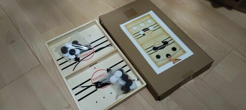Fábol készült "jégkorong" játék. Ennek a kistesója. 22x35 cm-es 2000 ft11 db-os fa "kövek" építős játék. Ennek a kistesója. 1500 ft