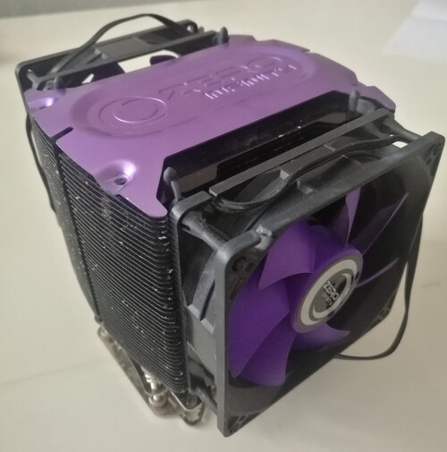 cpu hűtő: Zero infinity Shiva AM3/AM3+ felfogatással, fekete lila CPU hűtő, 2db fekete lila 92mm ventilátorral, 5db 8mm-es hőcsővel, jó hűtési teljesítménnyel, a bordák szélén pár helyen korából szerelgetésekből adódó festékleverődések vannak, de sokat nem ront az esztétikai állapotán. - 5000 Ft