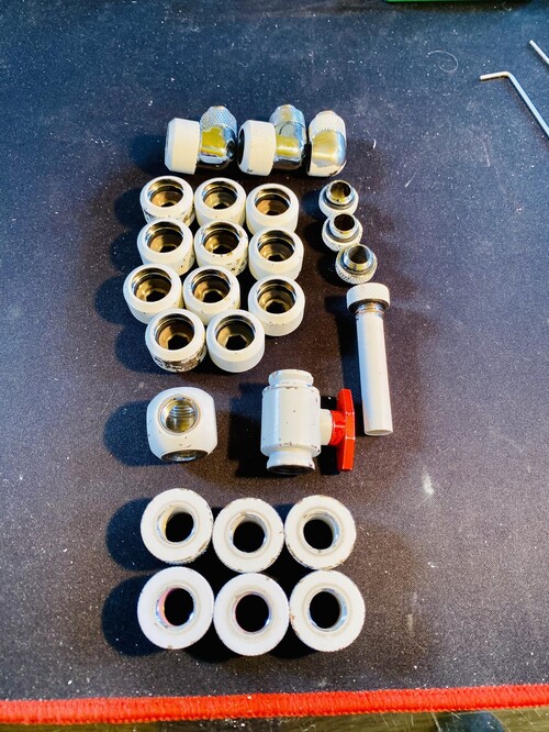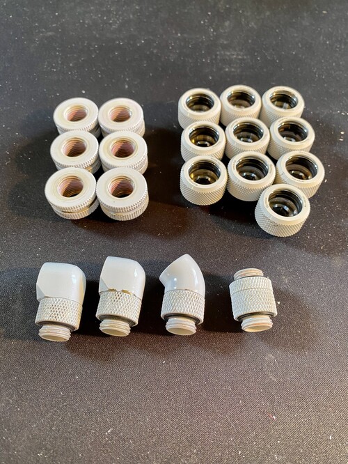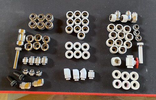 3. képen: Fehérek:16mm-es merev csőhöz (9db), pass trough (6db), 90fokos (2db), 45fokos (1db), toldó (1db)