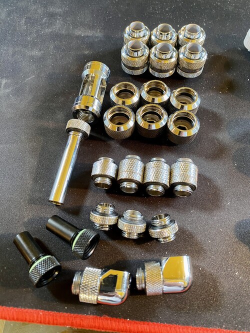 2. képen: Krómosak: 16mm-es merev csőhöz (6db), 19/13mm-es lágy csőhöz (6db), toldók (4db), beömlők (3db)