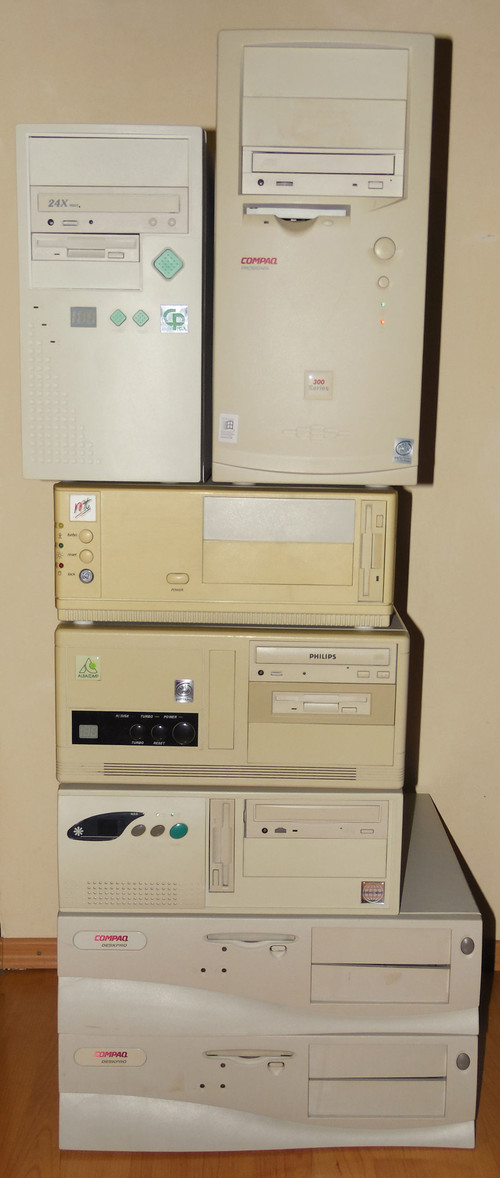 5, Monicomp, Gigabyte GA-586T2, Intel MMX 200, 32 Mb SD, S3Trio64V2/DX, 2,1 Gb HDD, CD+floppy, DIN/soros, procihűtő hangos