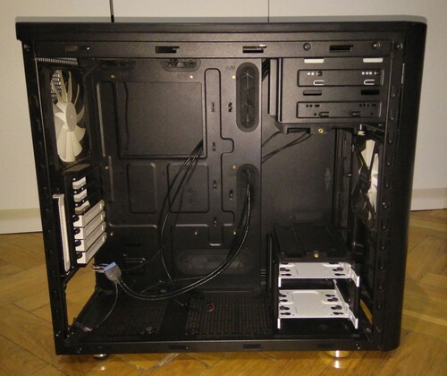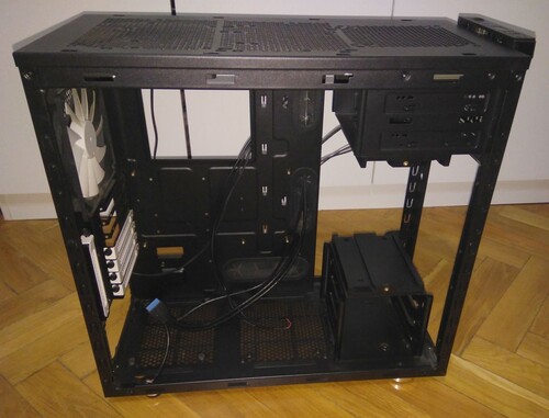 Elég tágas, jól szerelhető ház, alaplap tálca mögött elég hellyel a kábeleknek.
