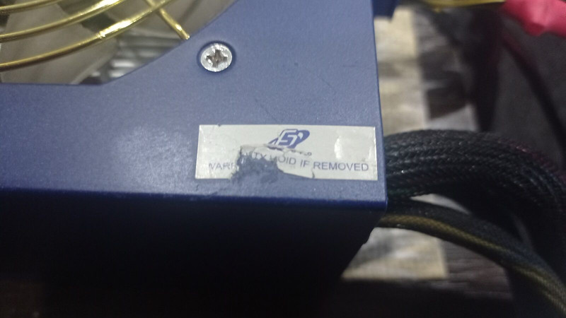 Egy beszerelés alkalmával sérült meg, a közeli képen tisztán látszik, hogy a csavar felett érintetlen. Noha garancia már nincs rá, de azért az elmondható : a tápegység még megbontatlan, belseje még gyári.